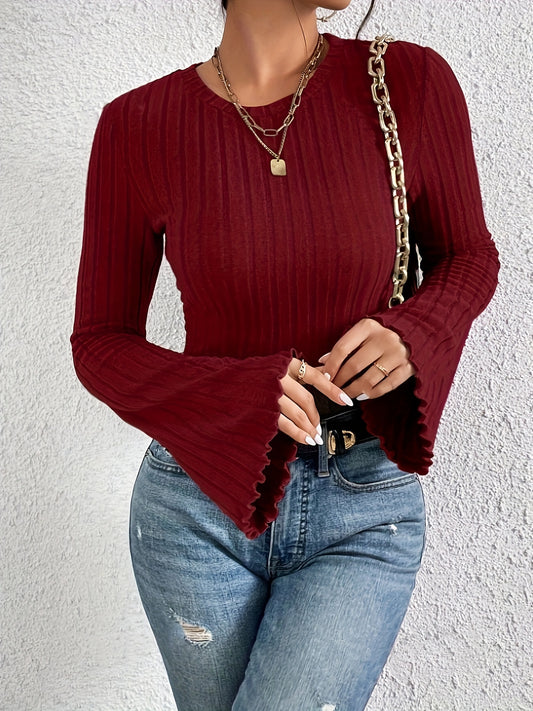 1pc French Style Ribbed T-Shirt for Women, Long Sleeve with Flounce Detail, Solid Color, Round Neck, Regular Length, Polyester Knit Fabric, Perfect for Spring/Autumn Season