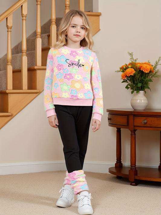 Girls' Autumn and Winter Fashion Warm Set with "Smile" Embroidery, Colorful Floral Appliqué Fleece Jacket and Flared Pants Outfit, Perfect for Outdoor