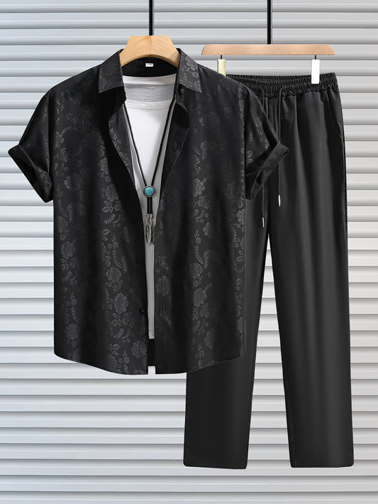 Men's Outfit, Casual Floral Graphic Print Lapel Short Sleeve Button Up Shirt & Drawstring Pants 2-piece Set For Outdoor Activities
