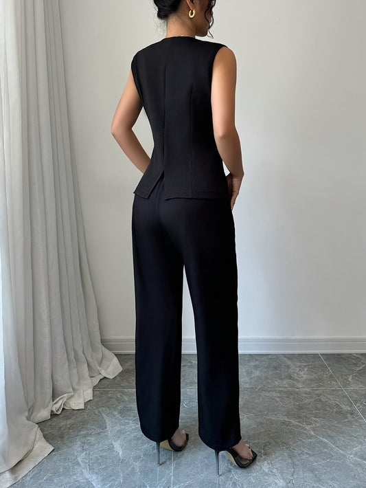 Elegant Crew Neck Pantsuit, Solid Color Sleeveless Suit, Polyester Blend Woven Fabric, Chic Office Wear for Women, for Spring/Fall
