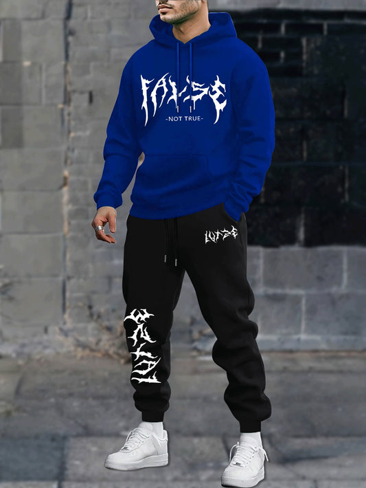 Durable Fabric, Men's Casual Sporty Hoodie and Jogger Set - Trendy Geometric Print, Blue and Black, Polyester Blend, Machine Washable, Perfect for Fall/Winter
