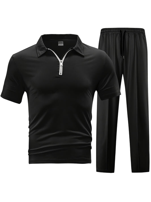 Men'S Casual 2pcs Set Knitted: Zipper Short Sleeve Shirt and Drawstring Pants - Black, Polyester, Suitable for Spring/Summer Casual Wea
