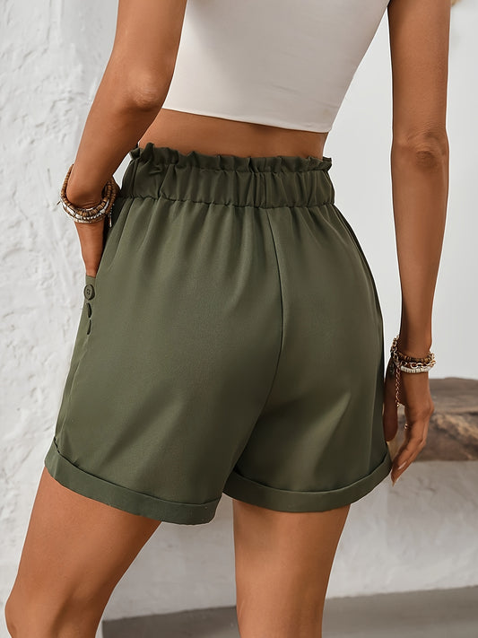 Solid Tassel Hem Loose Shorts, Vacation Paper Bag Waist Summer Shorts, Women's Clothing