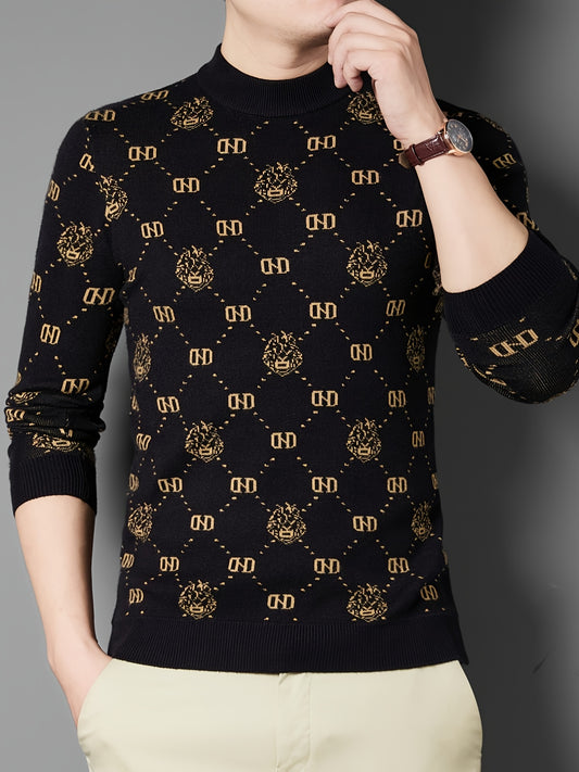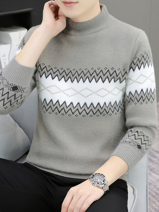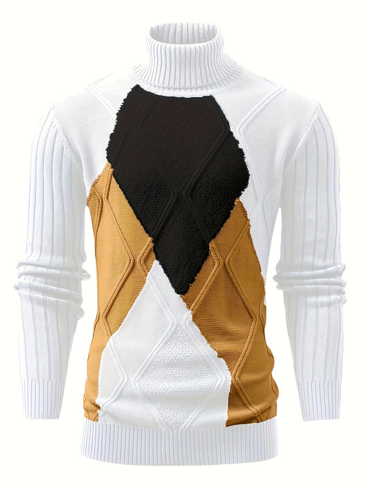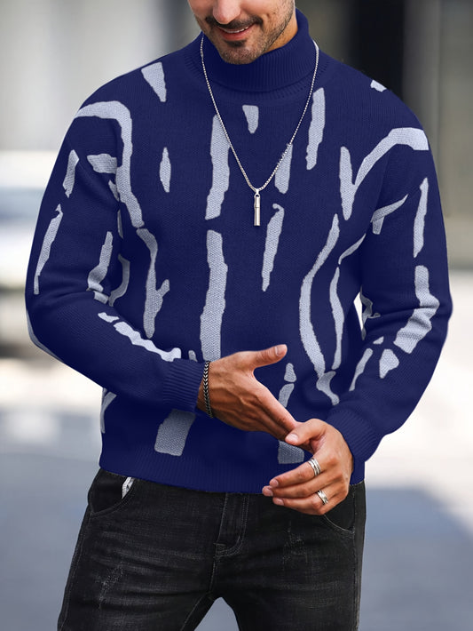 Men's Geometric Graphic Print Knitted Pullover, Casual Long Sleeve Turtle Neck Sweater For Fall Winter, Outdoor Cloth