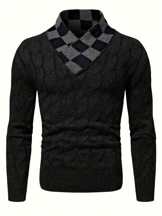 Maqiqiobm Slim Fit Men's Pullover Sweater - 1pc Autumn/Winter Thickened New Style, Comfortable Warm Solid Color Twist Knit Long Sleeve, Checkerboard Collar Design, Business Casual Daily Layering Knit Top, Suitable for Autumn