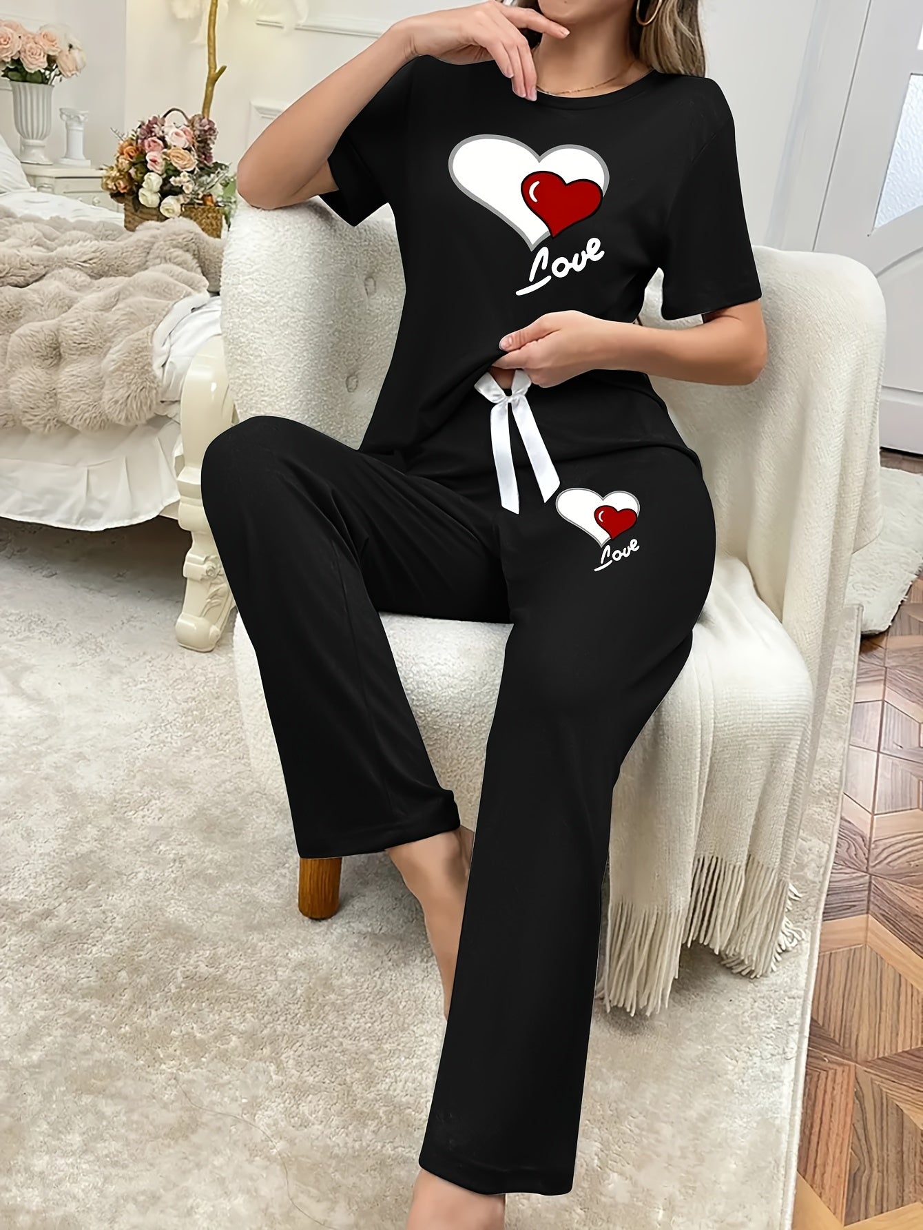 Casual Leisure Suit, Women's Double Love Print Short Sleeve Round Neck T-shirt and Pants Pajama Two-Piece Set Casual Comfortable Soft Home Clothes