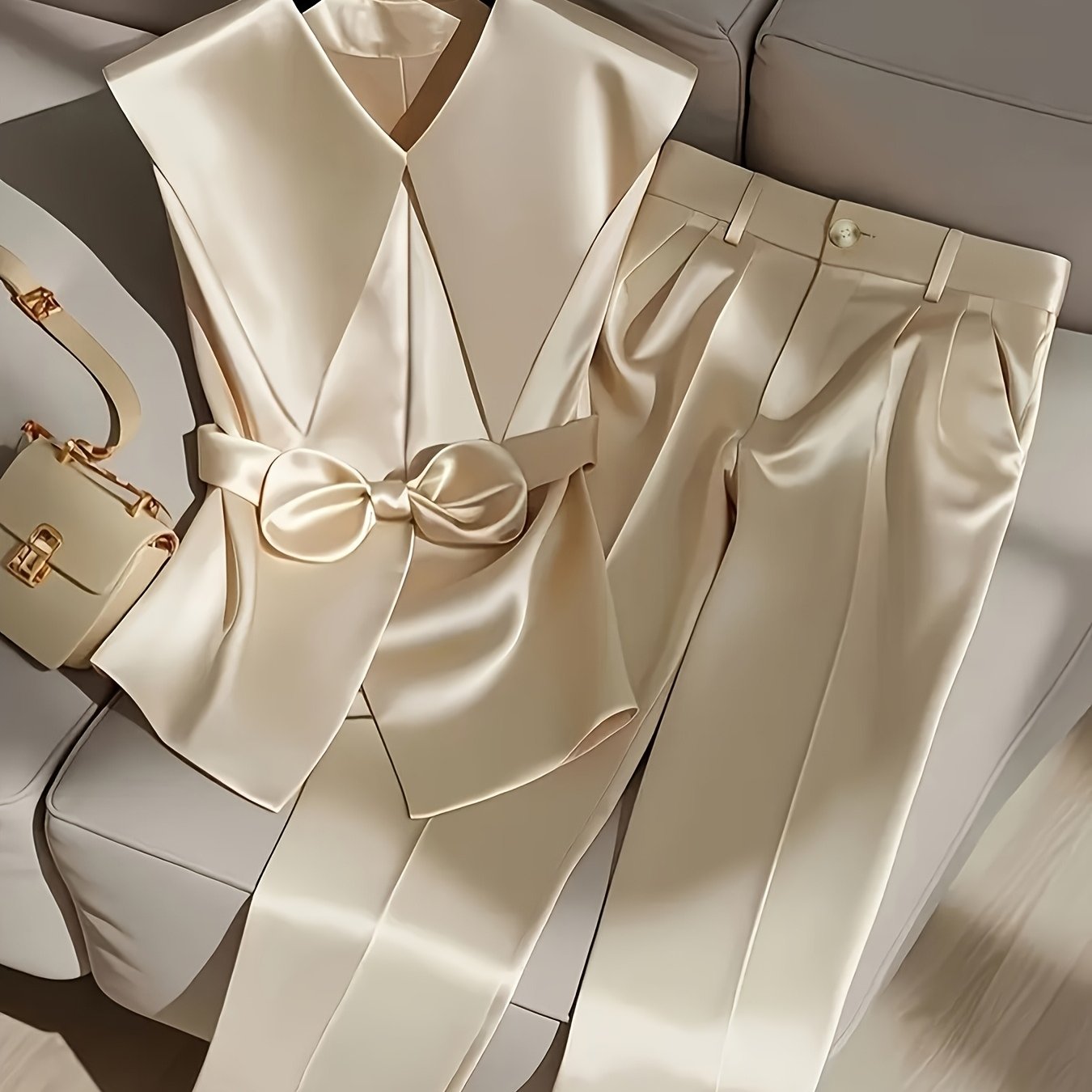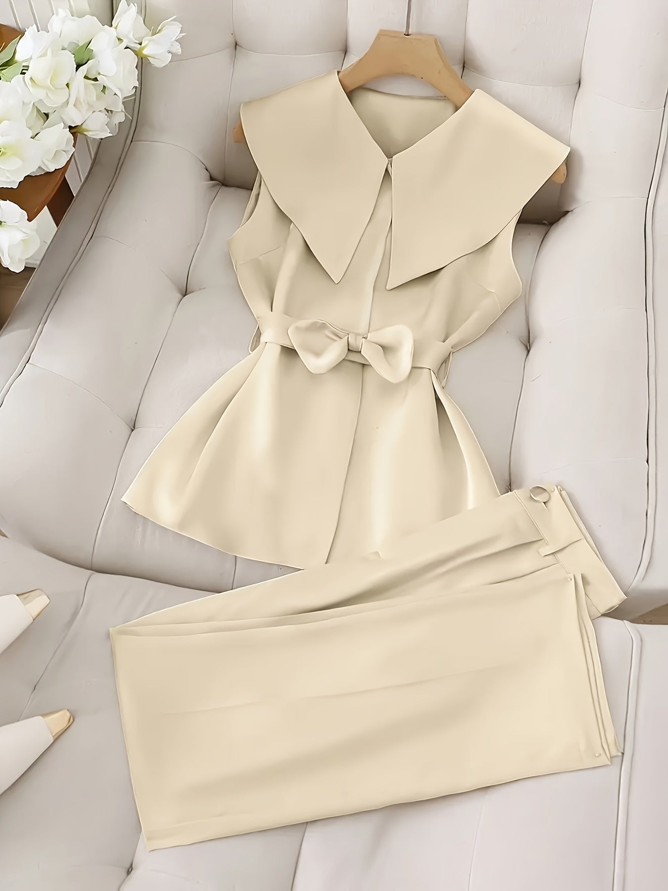 2 հատ էլեգանտ պոլիեսթերային տաբատային հավաքածու, ջրվեժաձև օձիք, միագույն անթև վերնաշապիկ և տաբատ, պոլիեսթերի և սպանդեքսի խառնուրդ, ժապավենաձև դետալներով, գարնանային և ամառային ոճ - Nian Nian