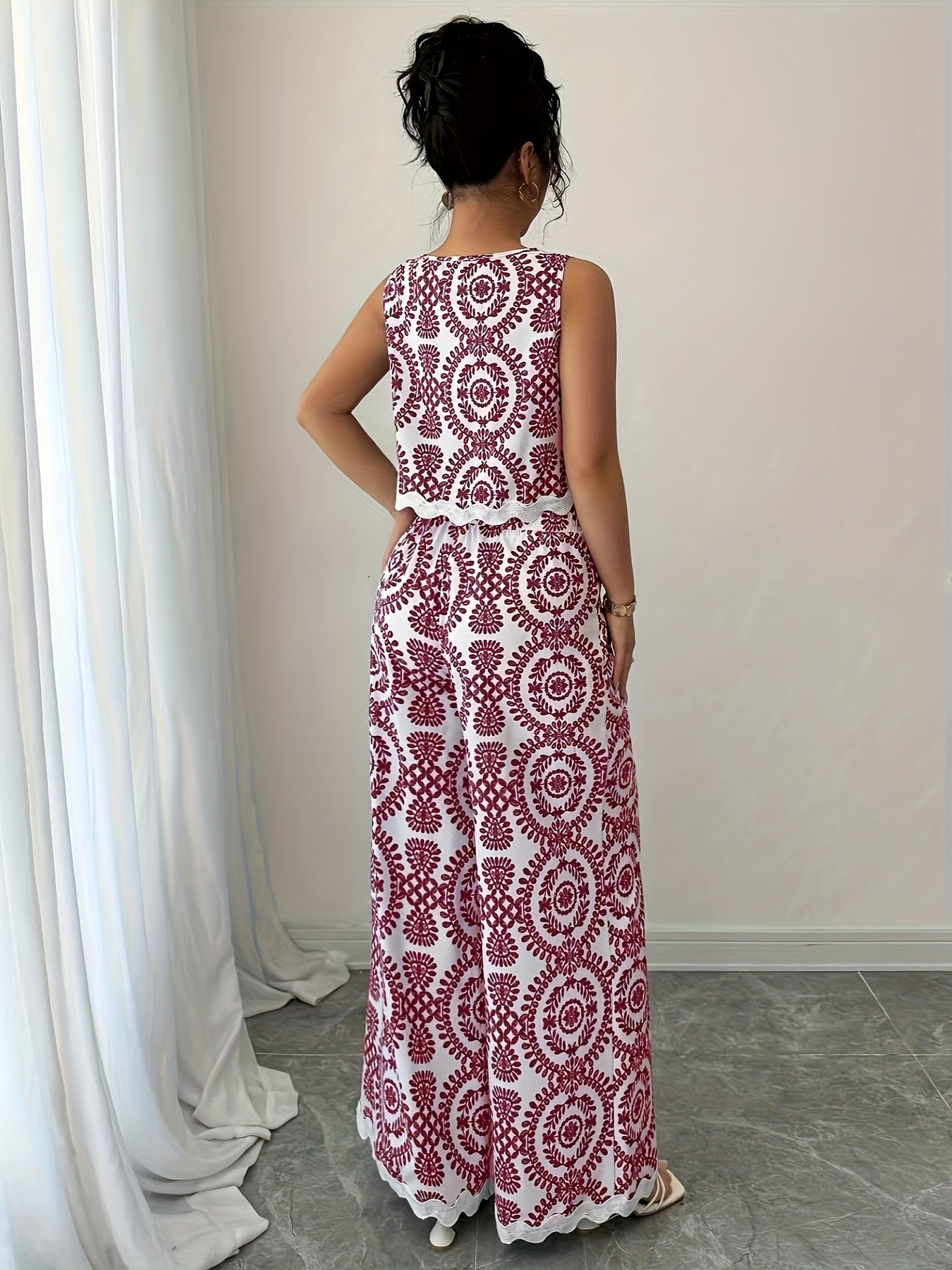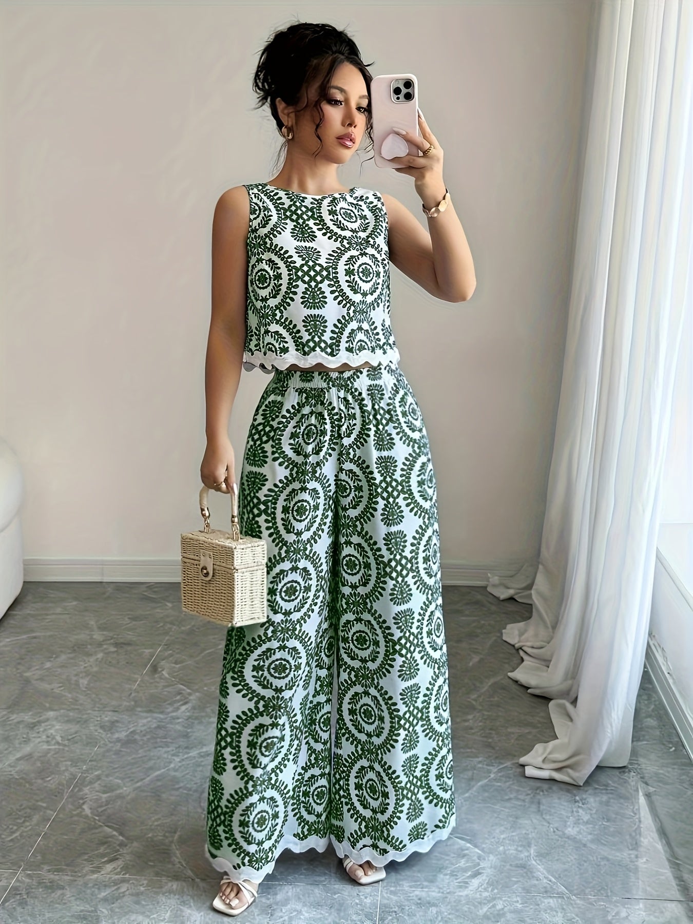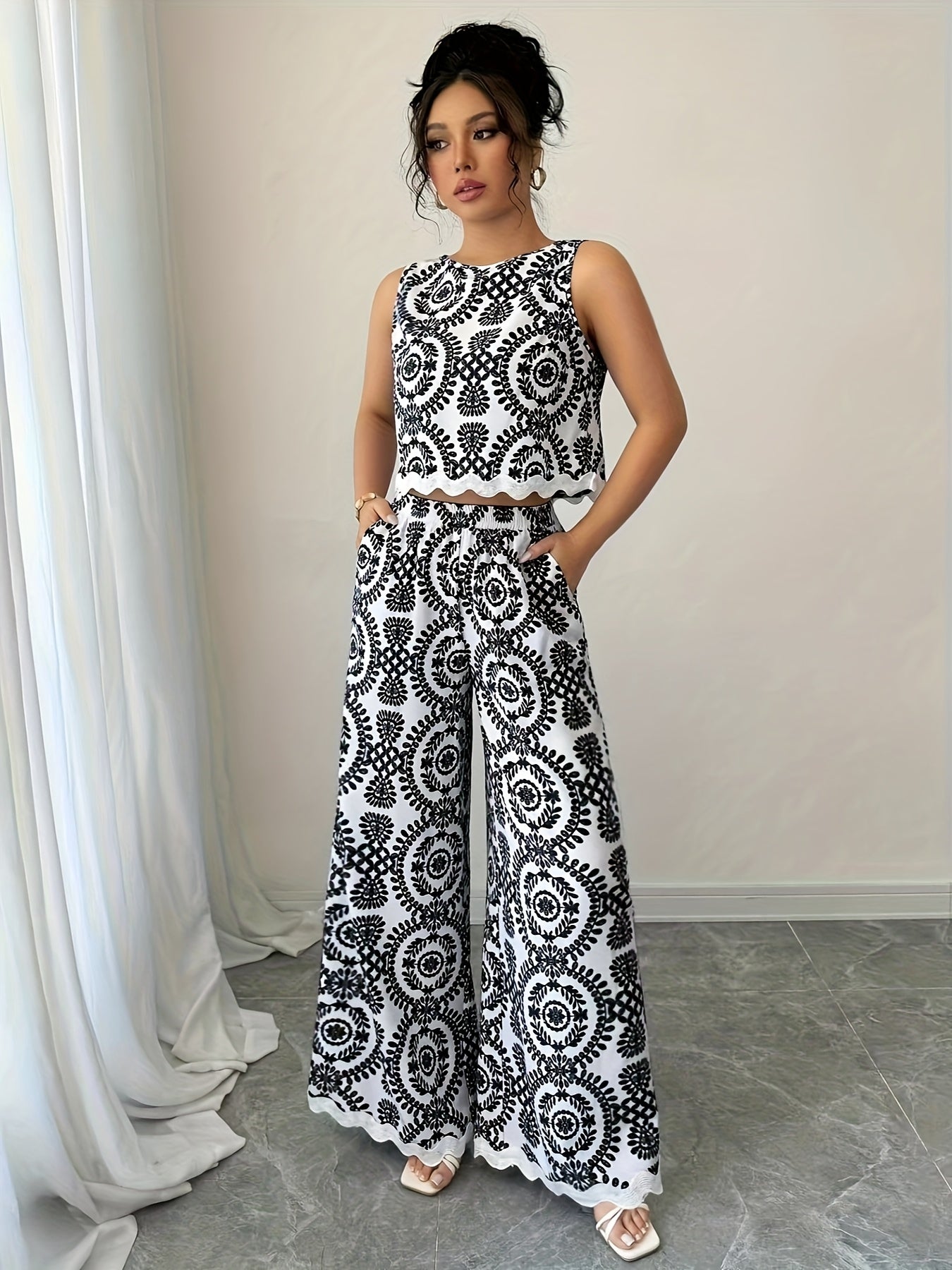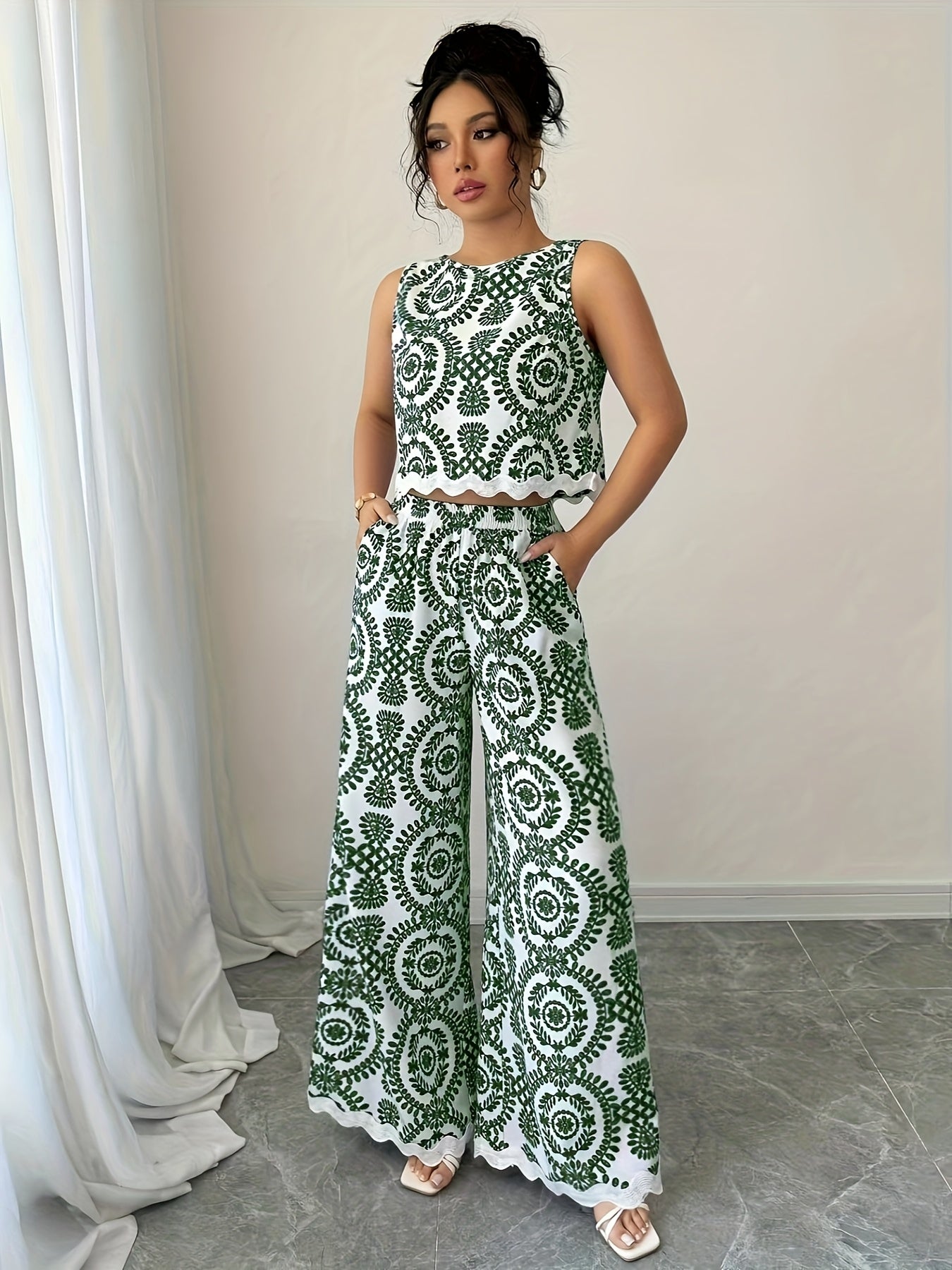 2 հատ կանացի բուսական նախշերով կլոր վզնոցով անթև վերնաշապիկի և տաբատի հավաքածու