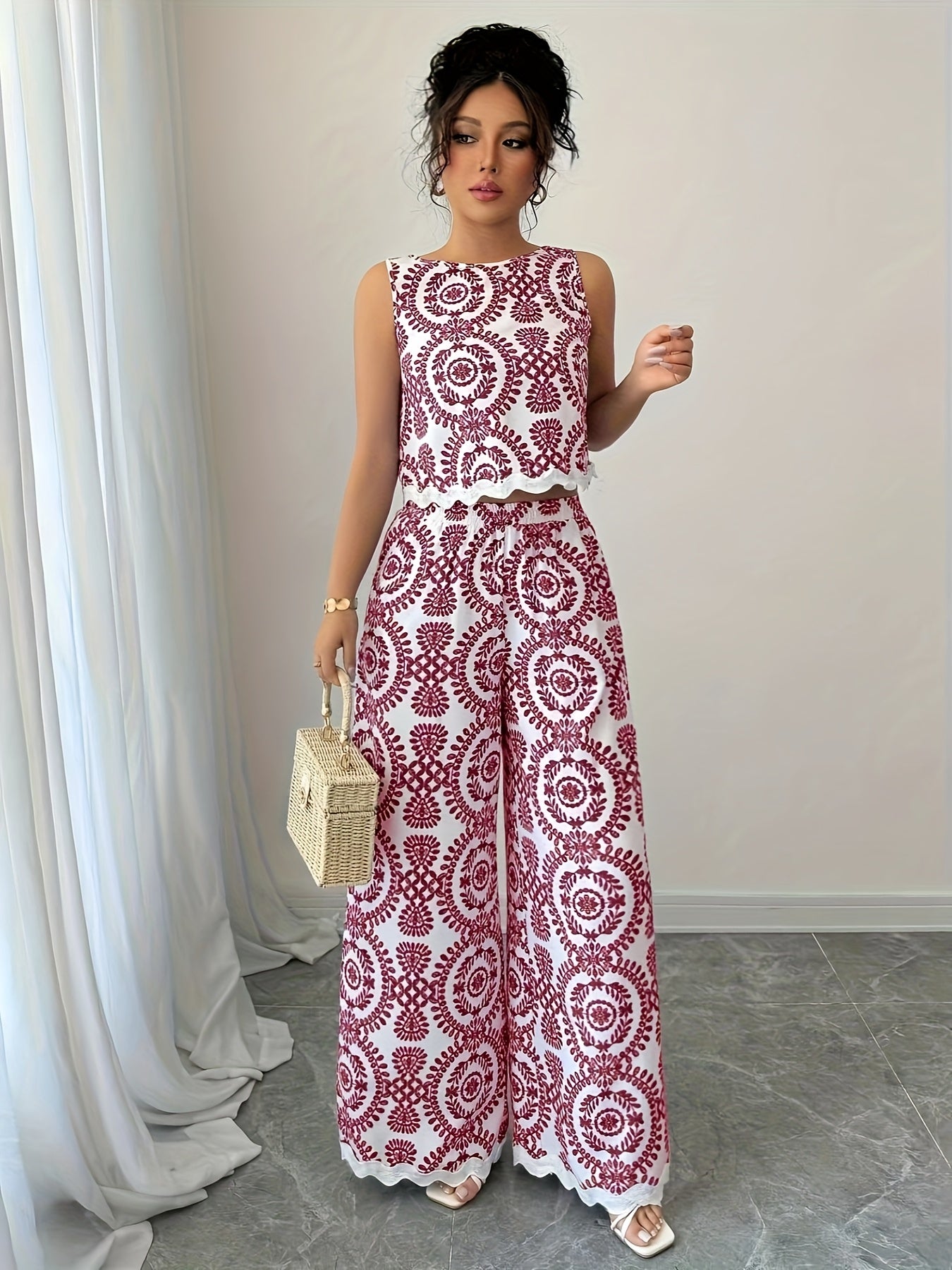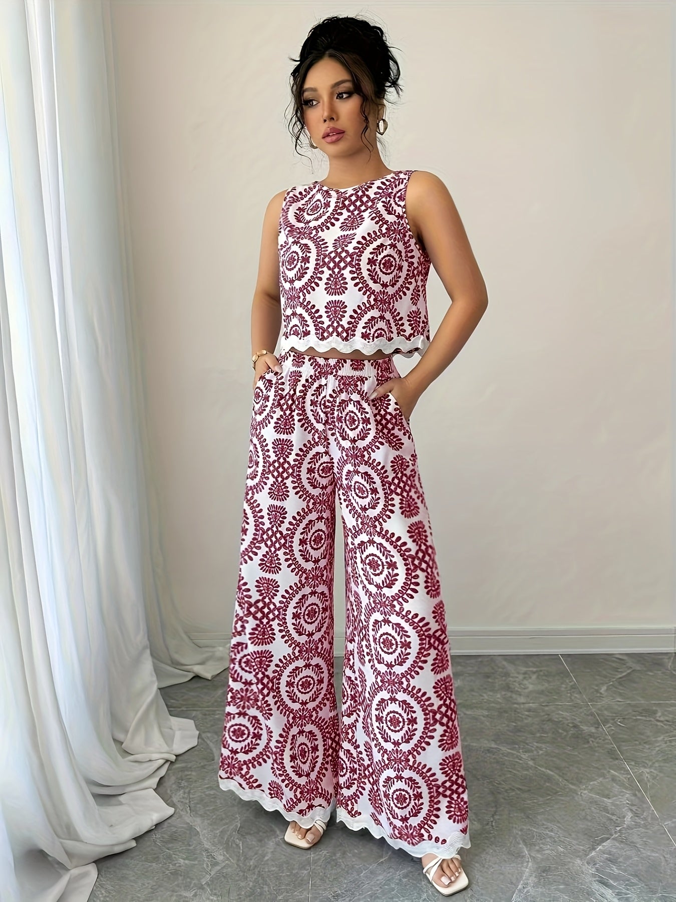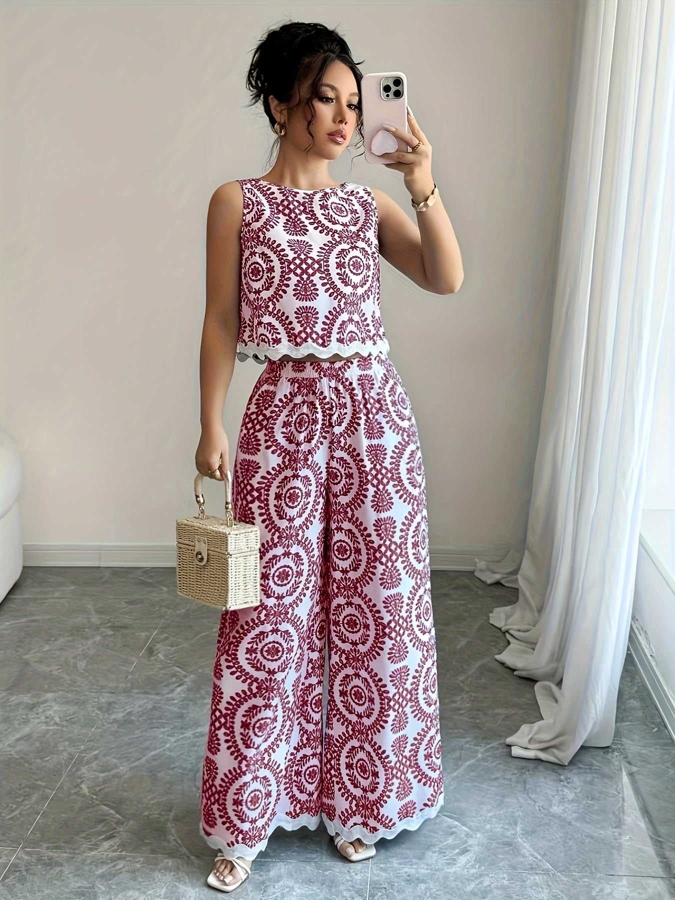 2 հատ կանացի բուսական նախշերով կլոր վզնոցով անթև վերնաշապիկի և տաբատի հավաքածու