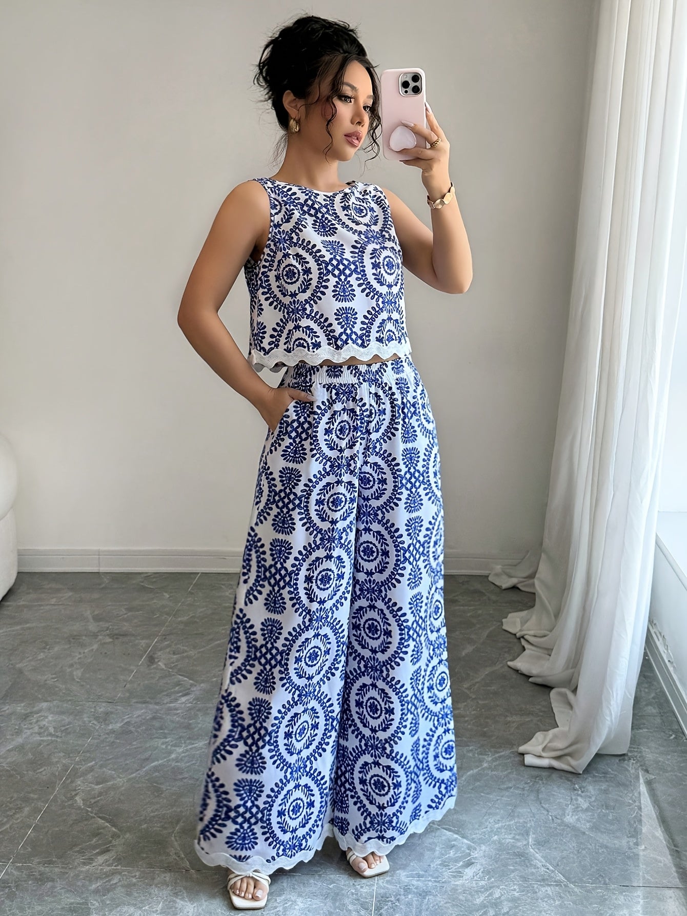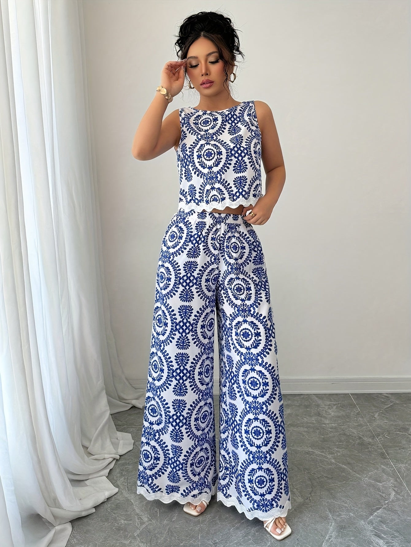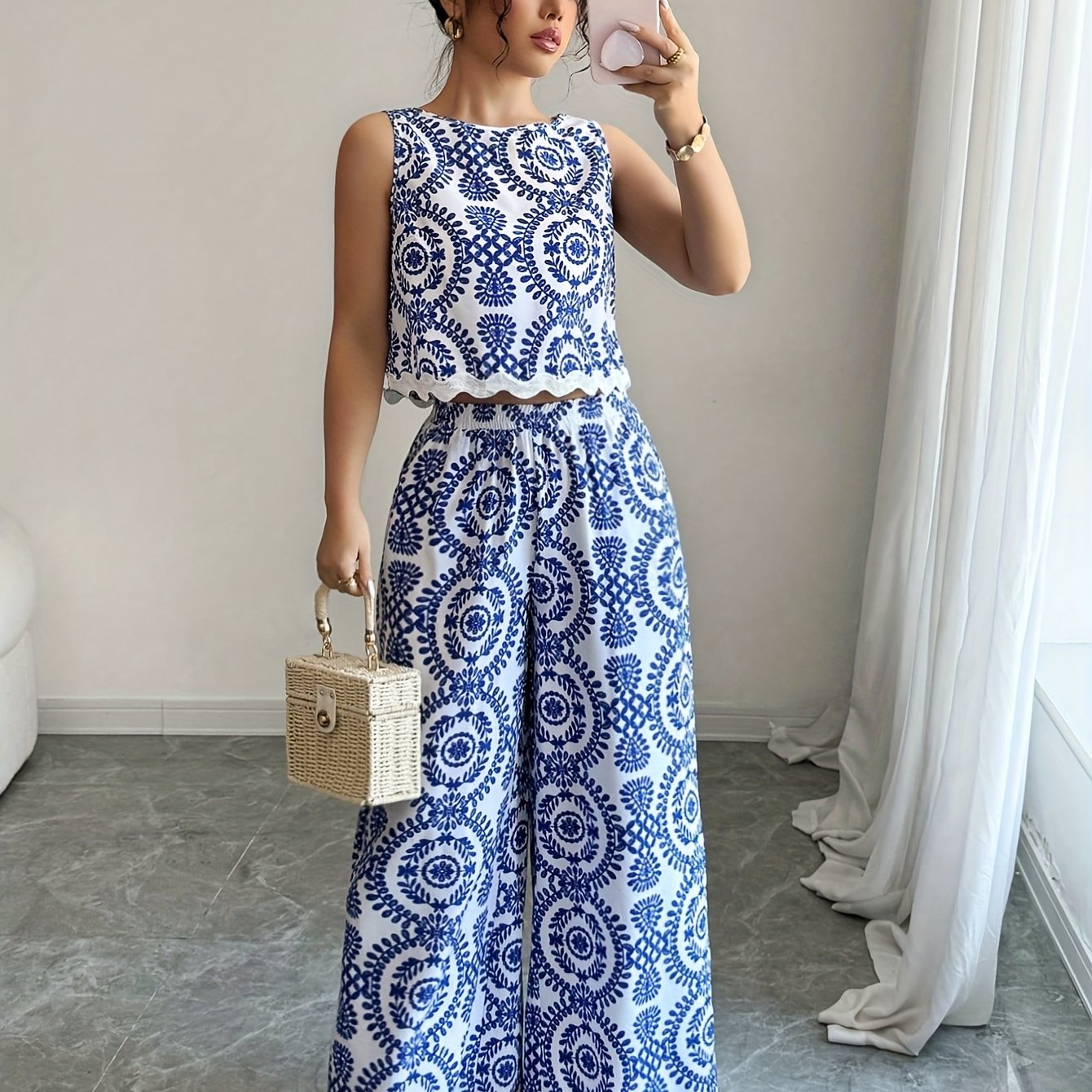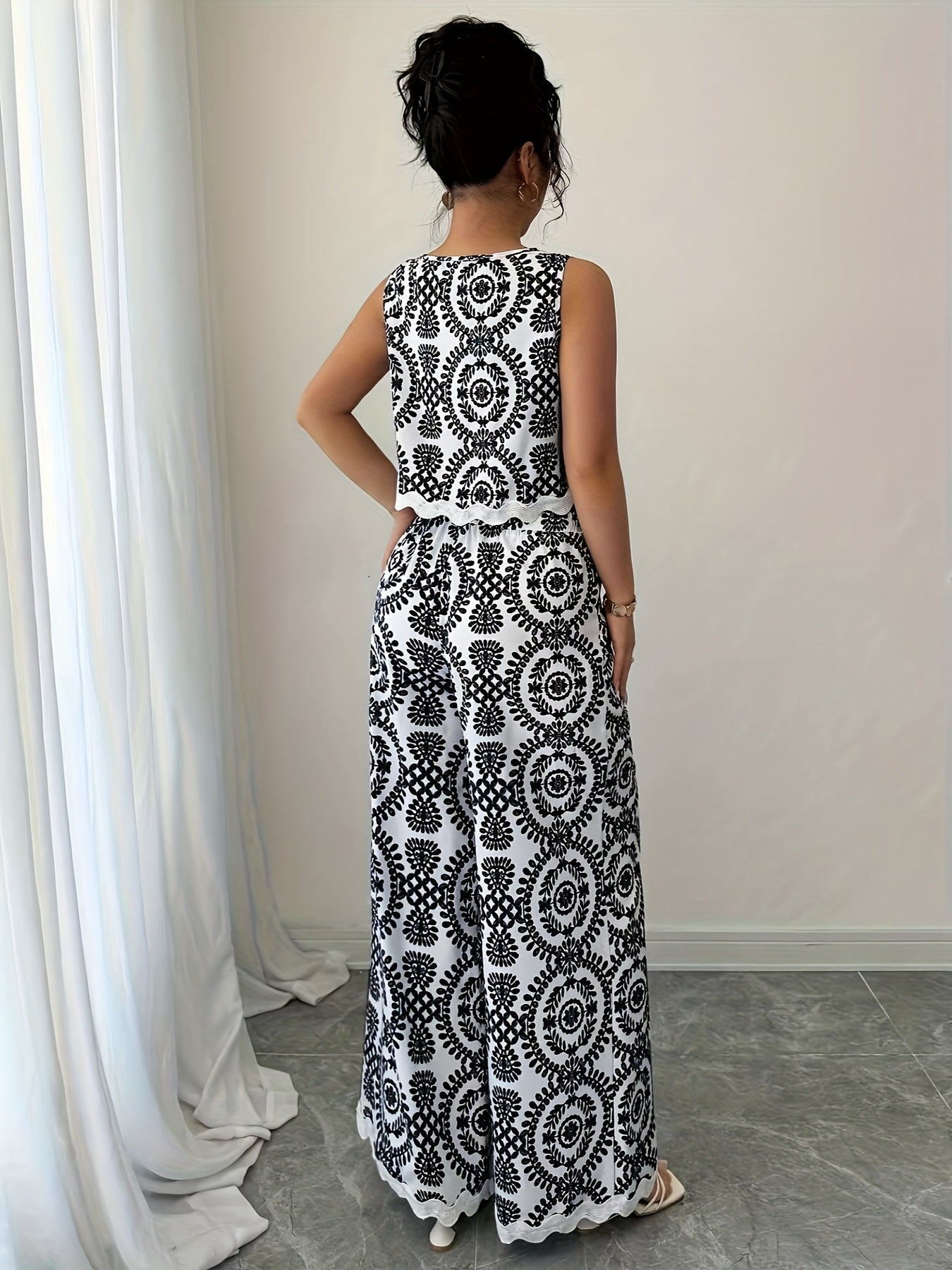 2 հատ կանացի բուսական նախշերով կլոր վզնոցով անթև վերնաշապիկի և տաբատի հավաքածու