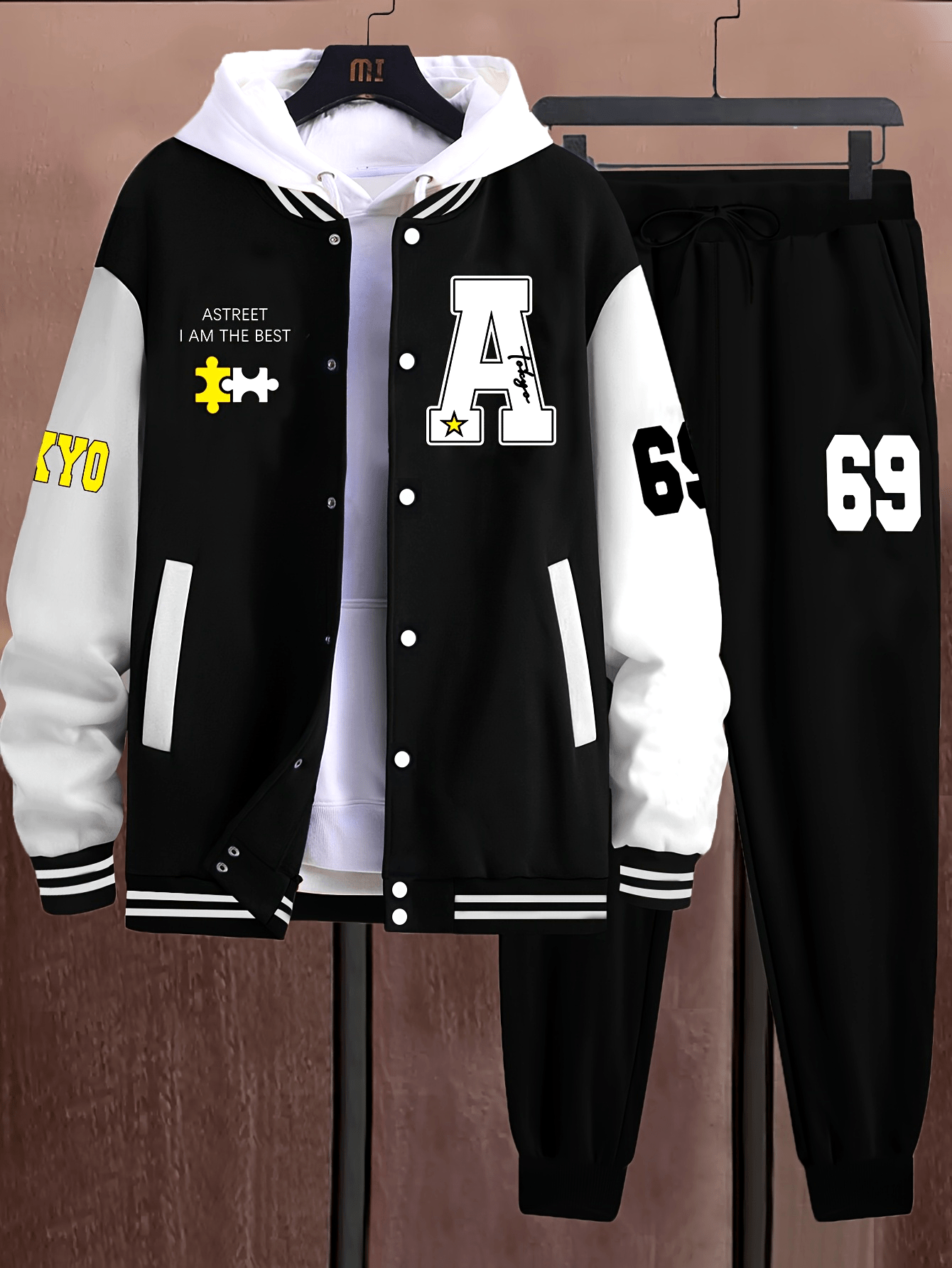 Սպորտային հագուստի անհրաժեշտ հավաքածու, տղամարդու առօրյա 69 հատանոց հավաքածու՝ գունային բլոկներով համալսարանական բաճկոն և A-69 նախշով մարզական տաբատ - պոլիեսթեր, բեյսբոլի օձիք, գրպաններ - իդեալական է աշուն/ձմեռ սեզոնի համար