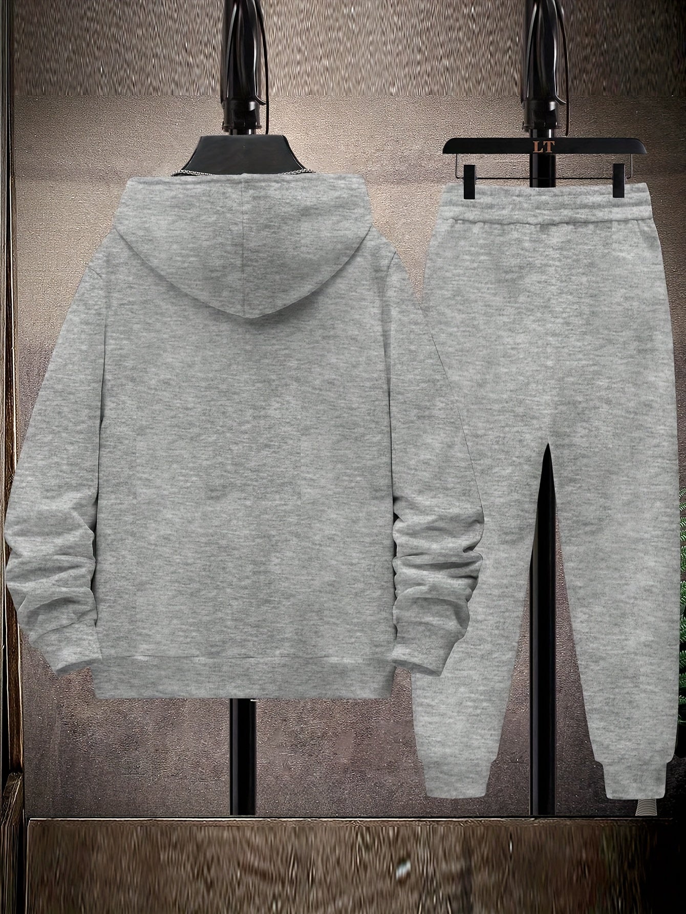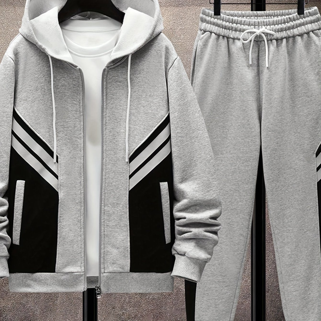 Տղամարդու մարզական բրդյա վերնաշապիկի և վազքի վերնաշապիկի հավաքածու - սպորտային մոխրագույն՝ սև զարդարանքներով, կայծակաճարմանդով բաճկոն և լարերով տաբատ, պոլիեսթեր, լվացքի մեքենայով աշուն/ձմեռ համար