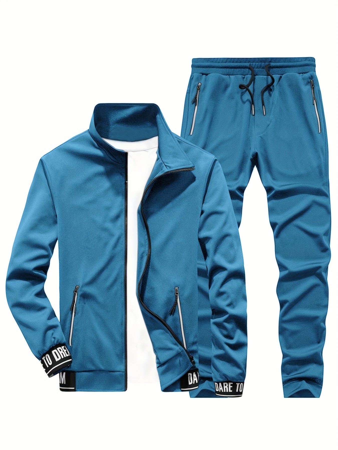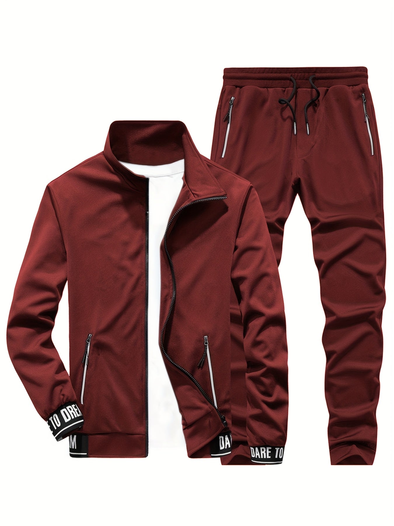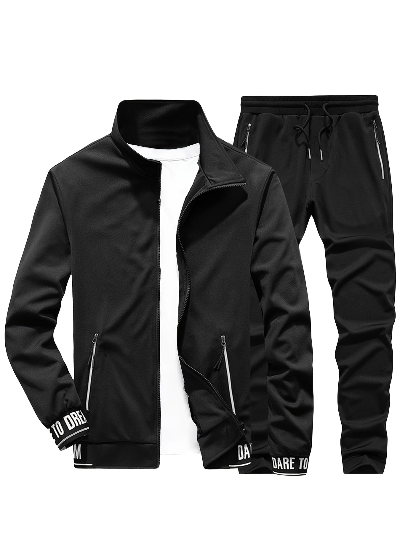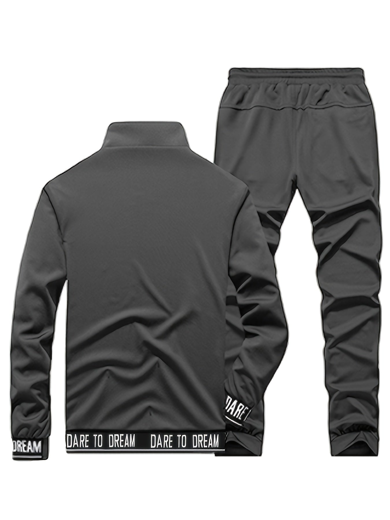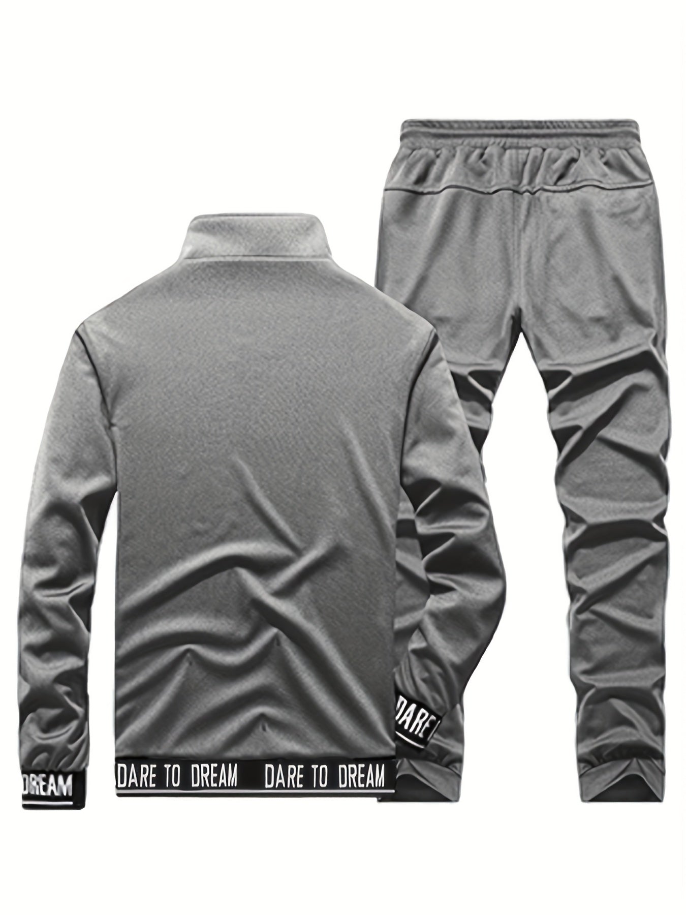 Տղամարդկանց ամենօրյա սպորտային հագուստի հավաքածու - բեժ գույնի ճարմանդով բաճկոն և մարզական տաբատ "DARE TO BE" տպագրությամբ, երկար թևերով, գրպաններով և քաշվող գոտիով, իդեալական է վազքի և հանգստի համար, գարուն/աշուն հավաքածու, գարուն-աշուն հագուստ | Zipup J