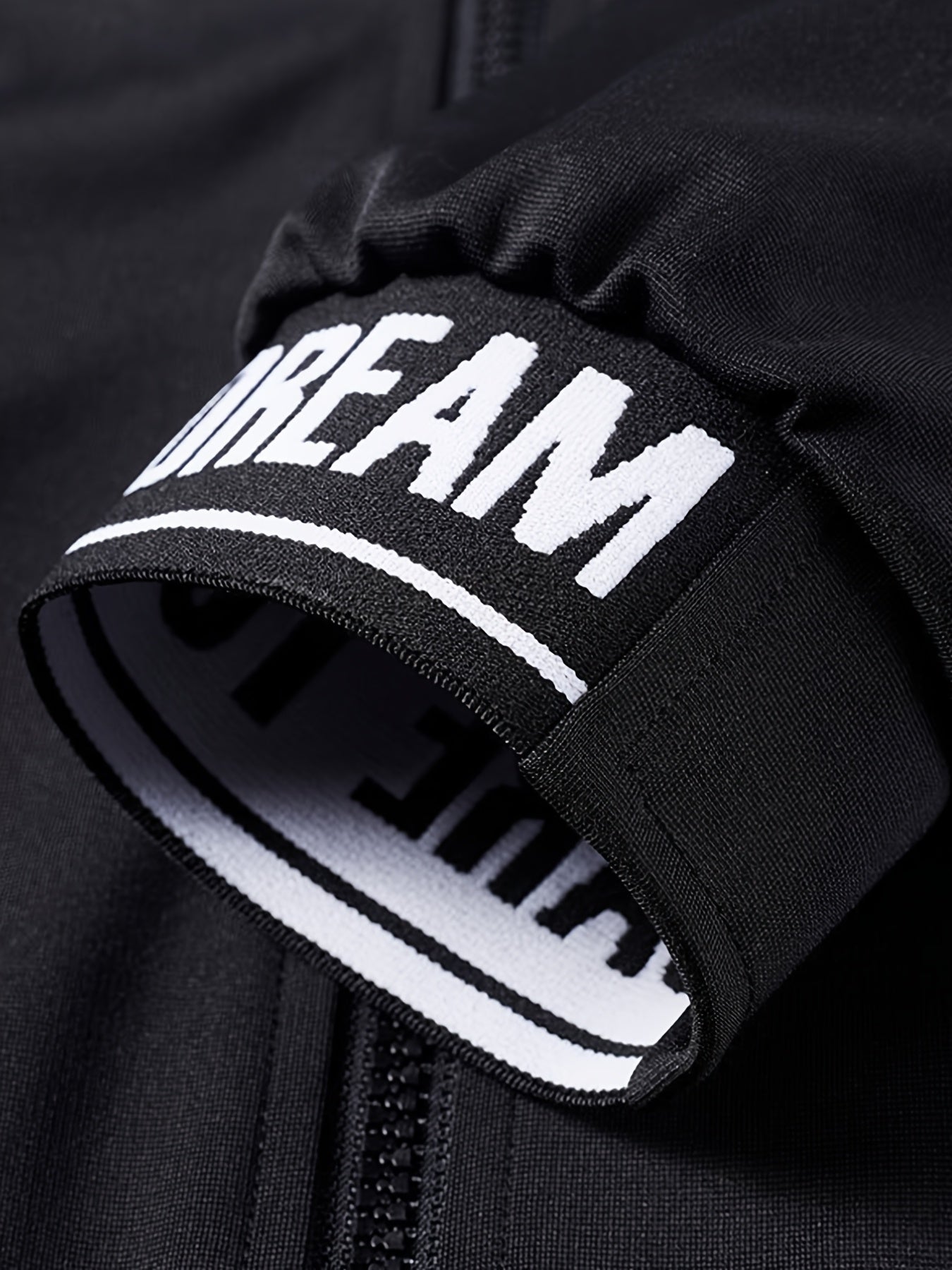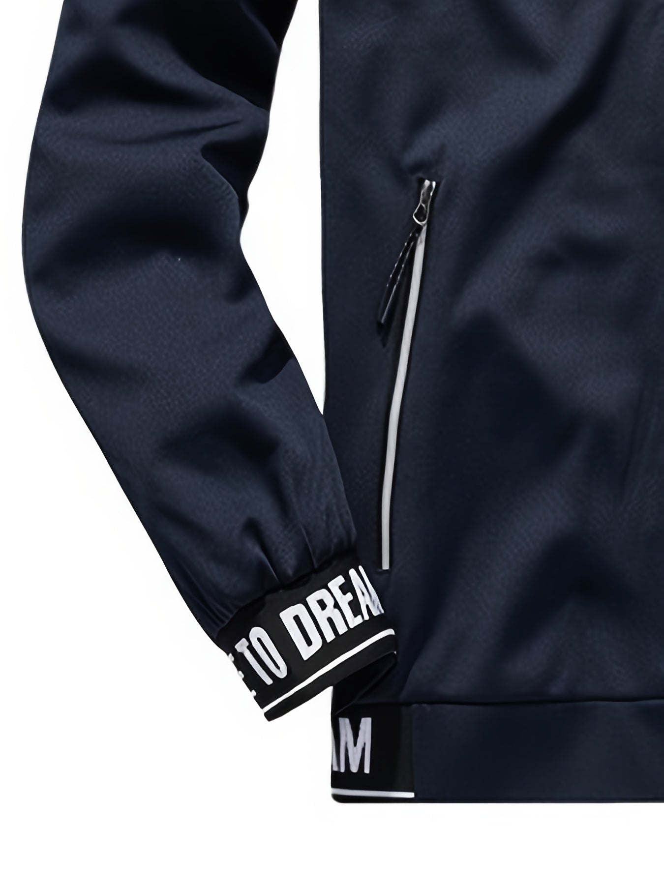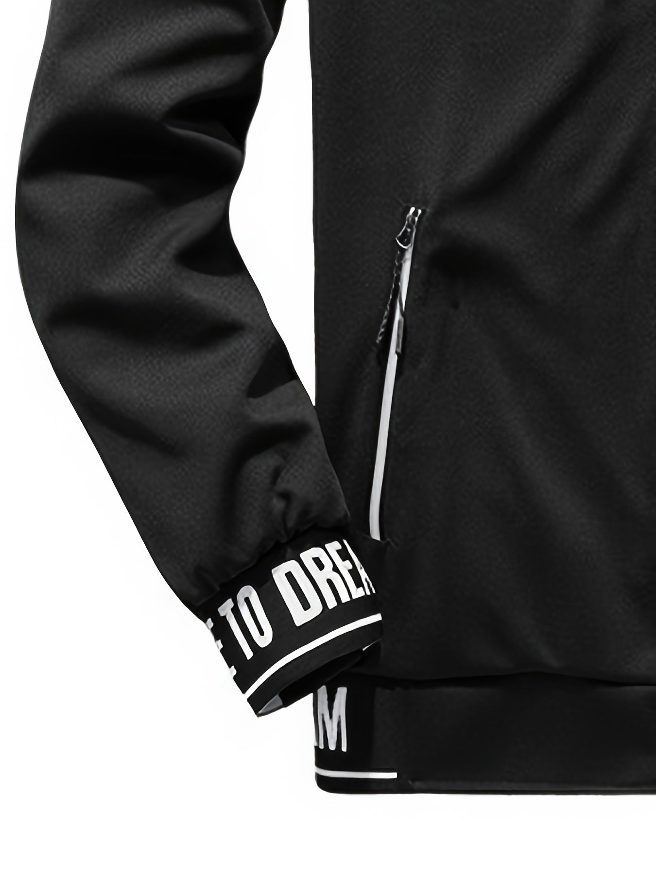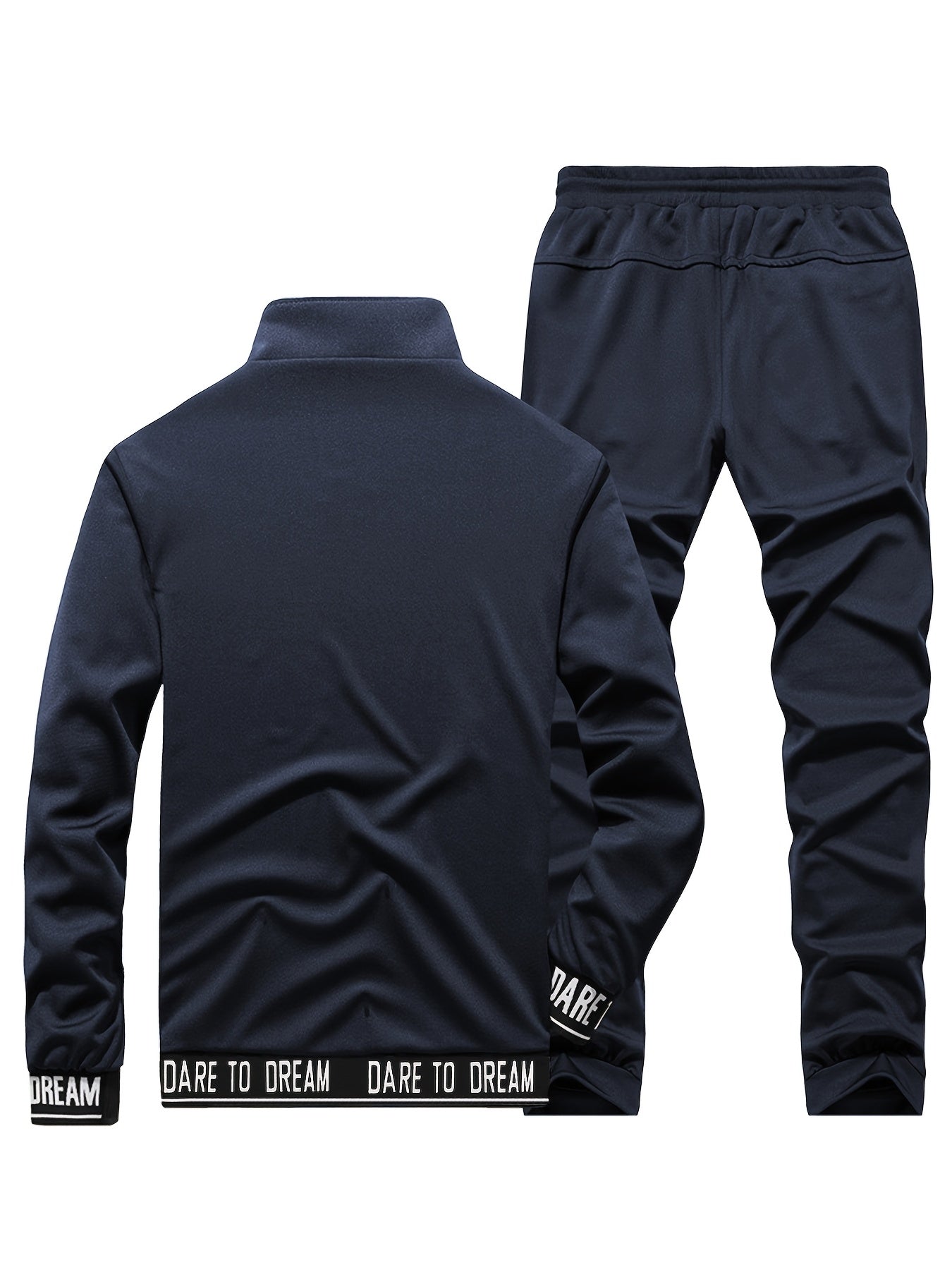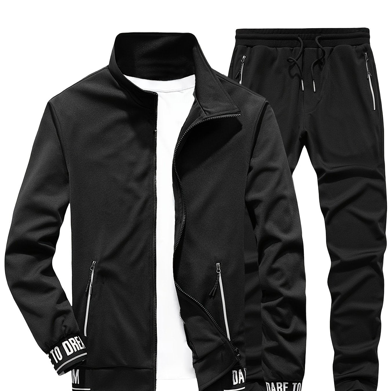 Տղամարդկանց ամենօրյա սպորտային հագուստի հավաքածու - բեժ գույնի ճարմանդով բաճկոն և մարզական տաբատ "DARE TO BE" տպագրությամբ, երկար թևերով, գրպաններով և քաշվող գոտիով, իդեալական է վազքի և հանգստի համար, գարուն/աշուն հավաքածու, գարուն-աշուն հագուստ | Zipup J