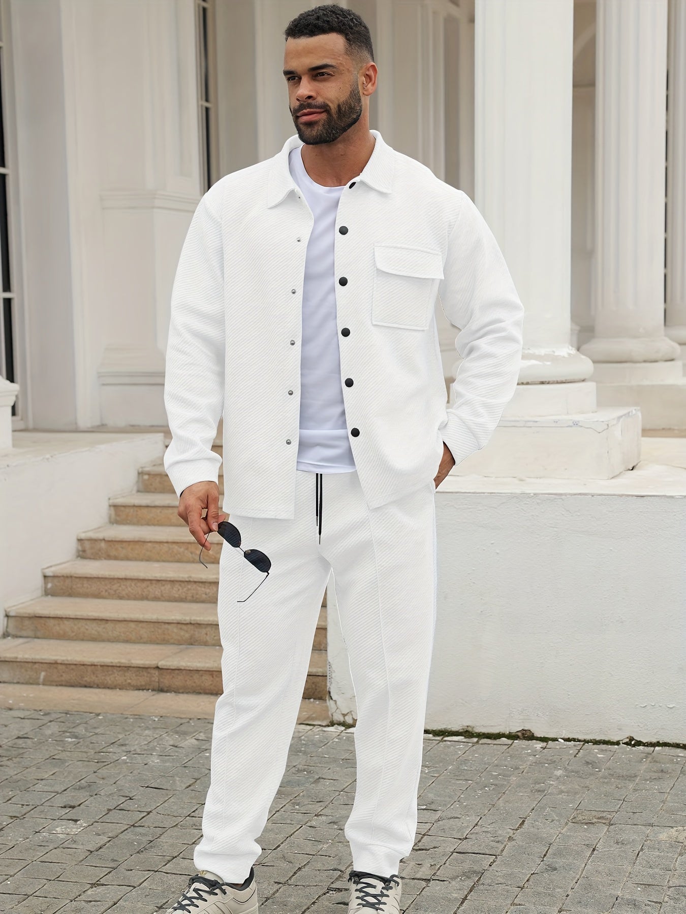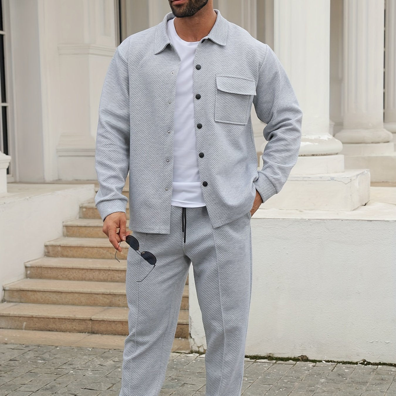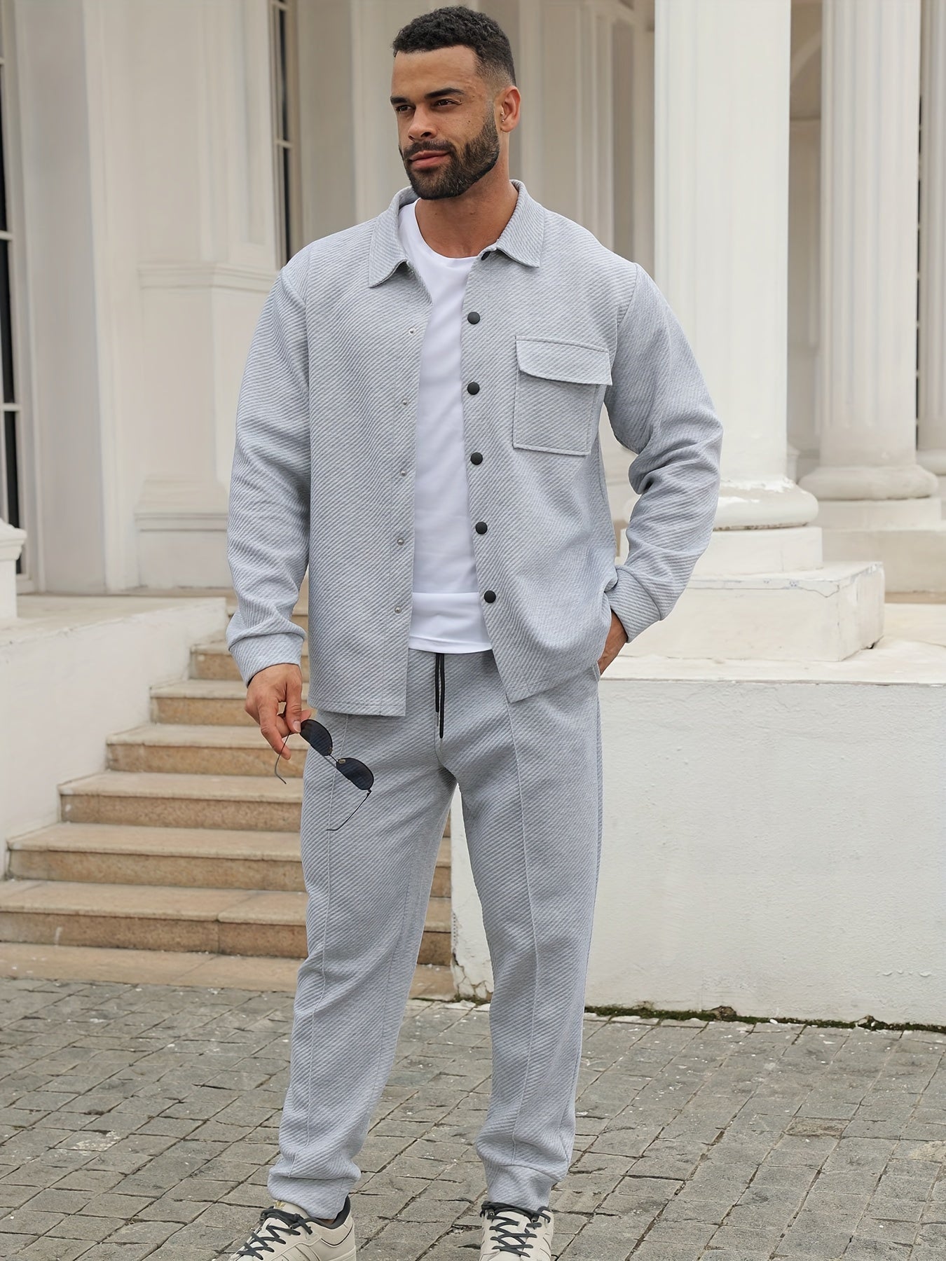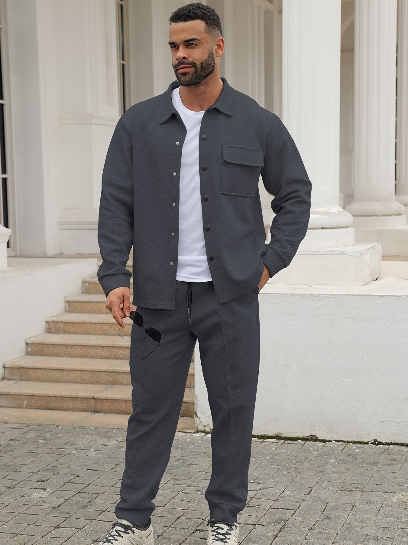 Տղամարդու առօրյա սպորտային հագուստի հավաքածու - Երկար թևքերով, կոճակներով վերնաշապիկ և ջոգեր, ձգվող գործվածքից, գարուն/աշուն հավաքածու