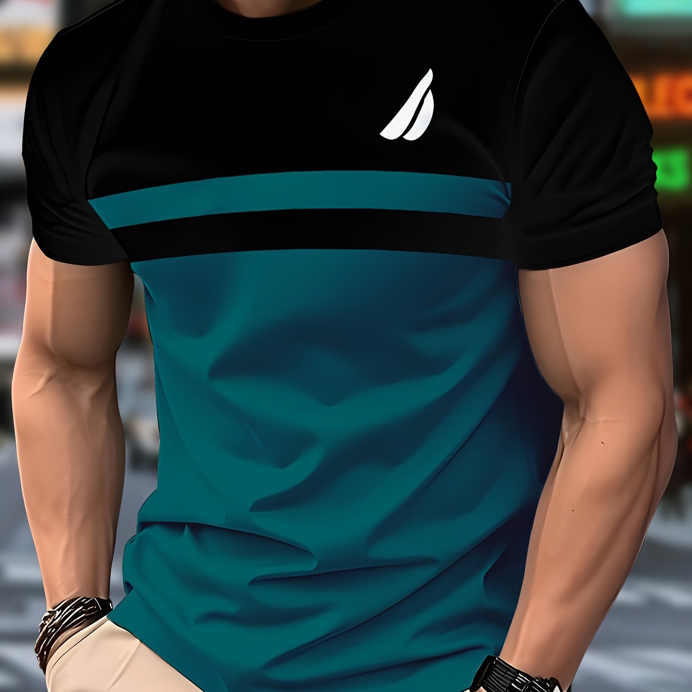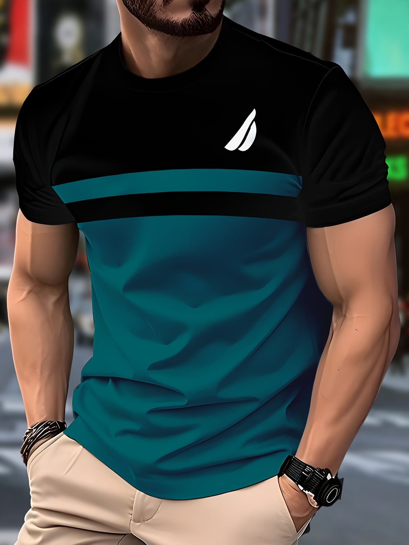 Տղամարդու նորաձև շապիկ - սև, կապտականաչավուն գույնի նախշերով, կարճ թևքերով, կանոնավոր չափսերով, պոլիեսթերային գործվածքով, իդեալական է առօրյա հագուստի համար, նորաձև շապիկ
