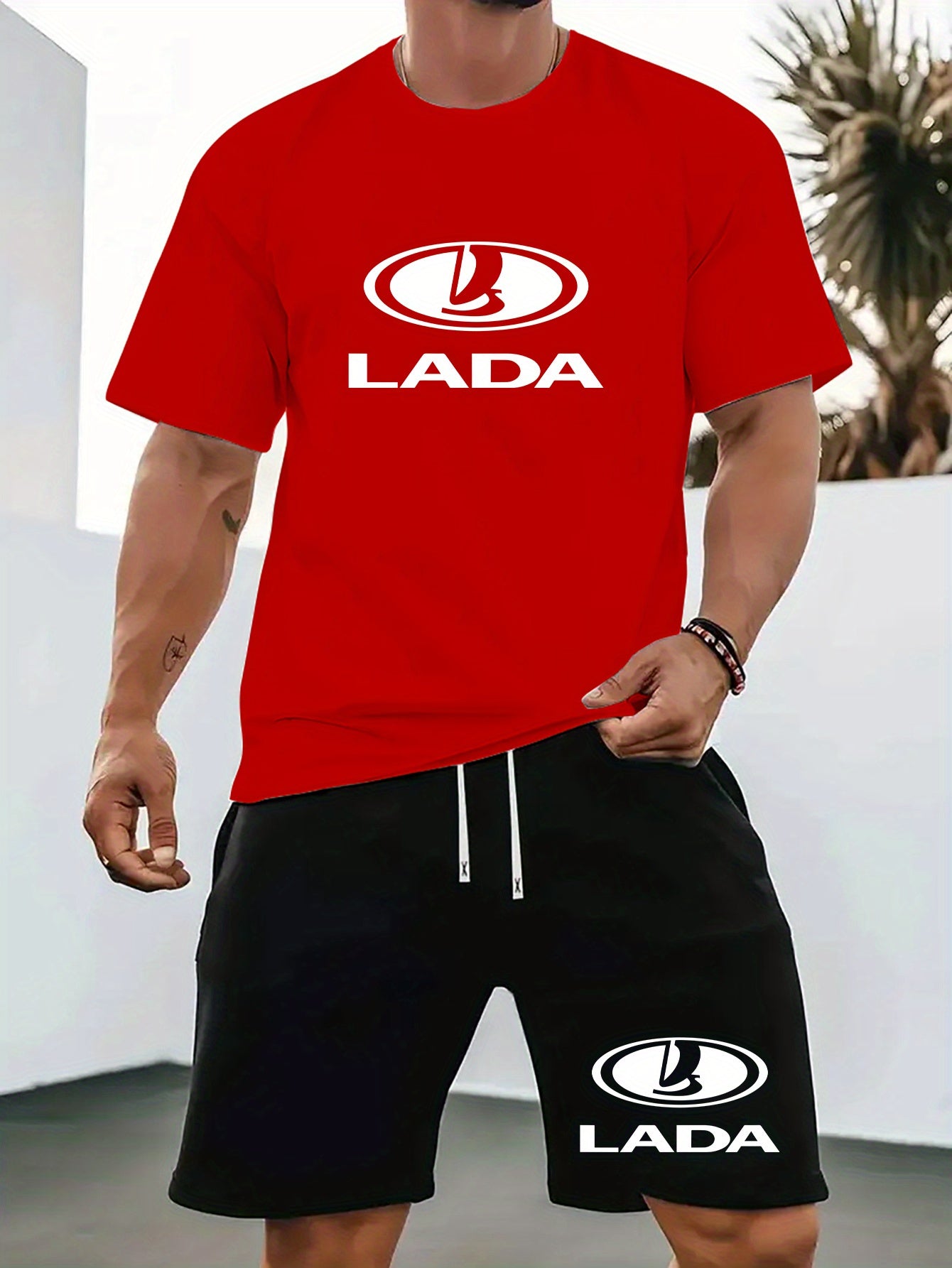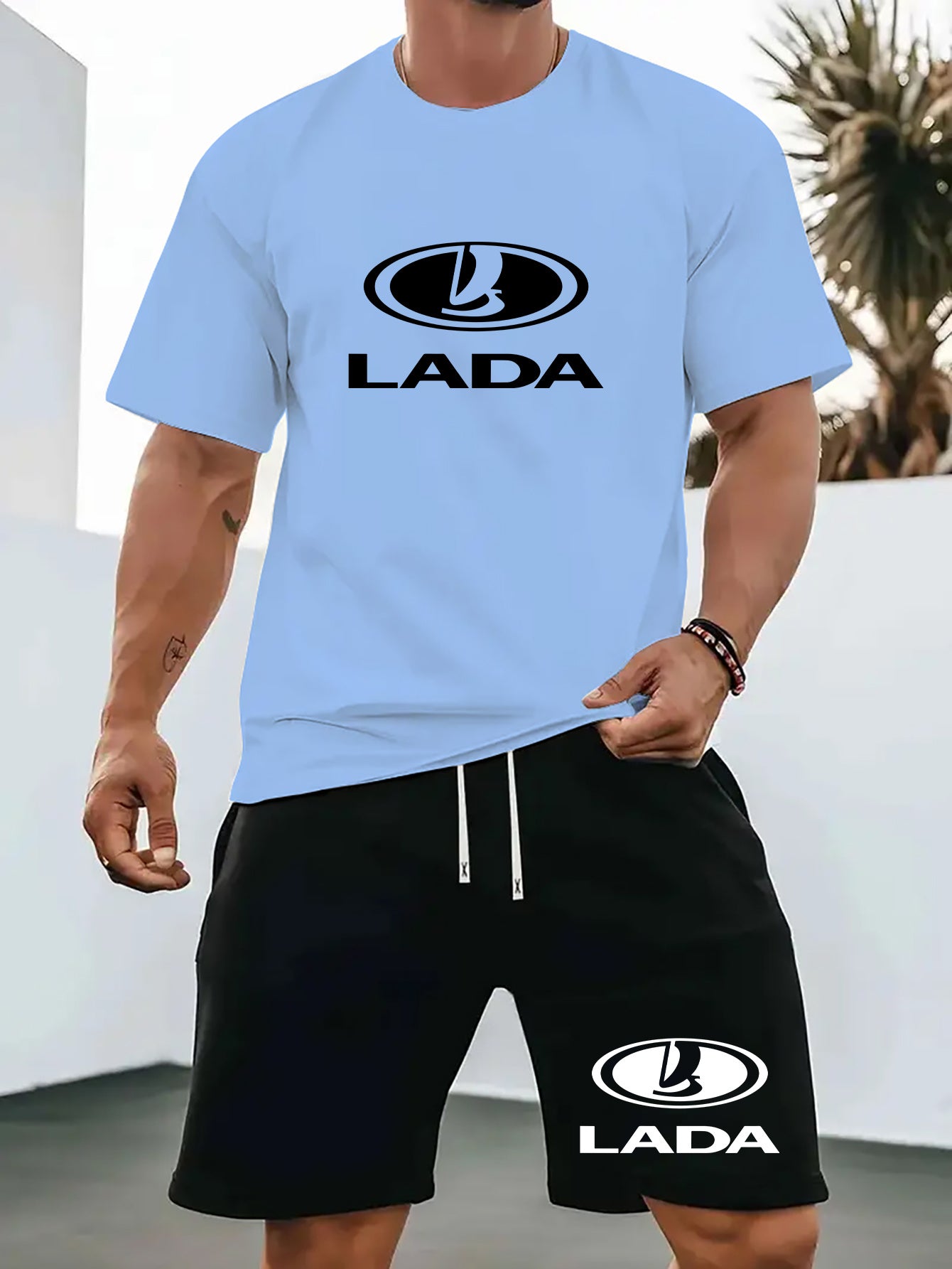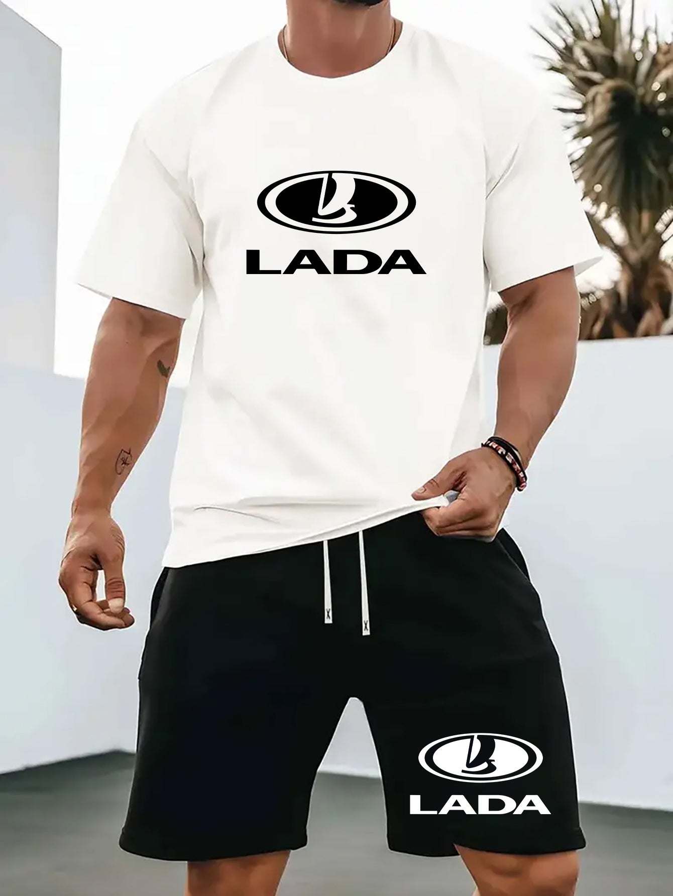 Տղամարդկանց ամառային առօրյա սպորտային երկու մասից բաղկացած հավաքածու՝ LADA տառերով նախշերով շապիկ և սև լարով շորտեր, առօրյա սպորտային հագուստ, սովորական չափս՝ իդեալական ամառային բացօթյա օգտագործման համար։