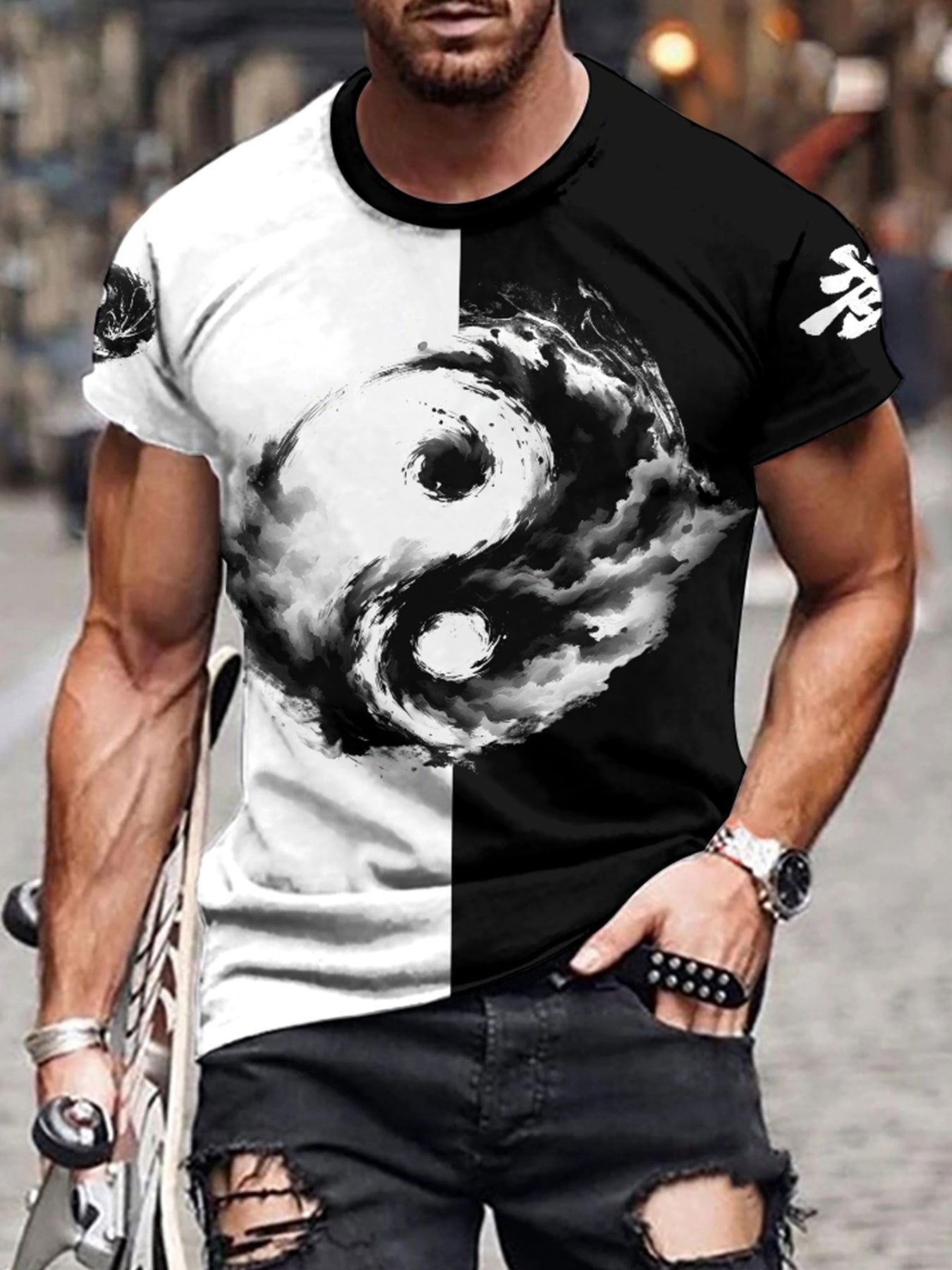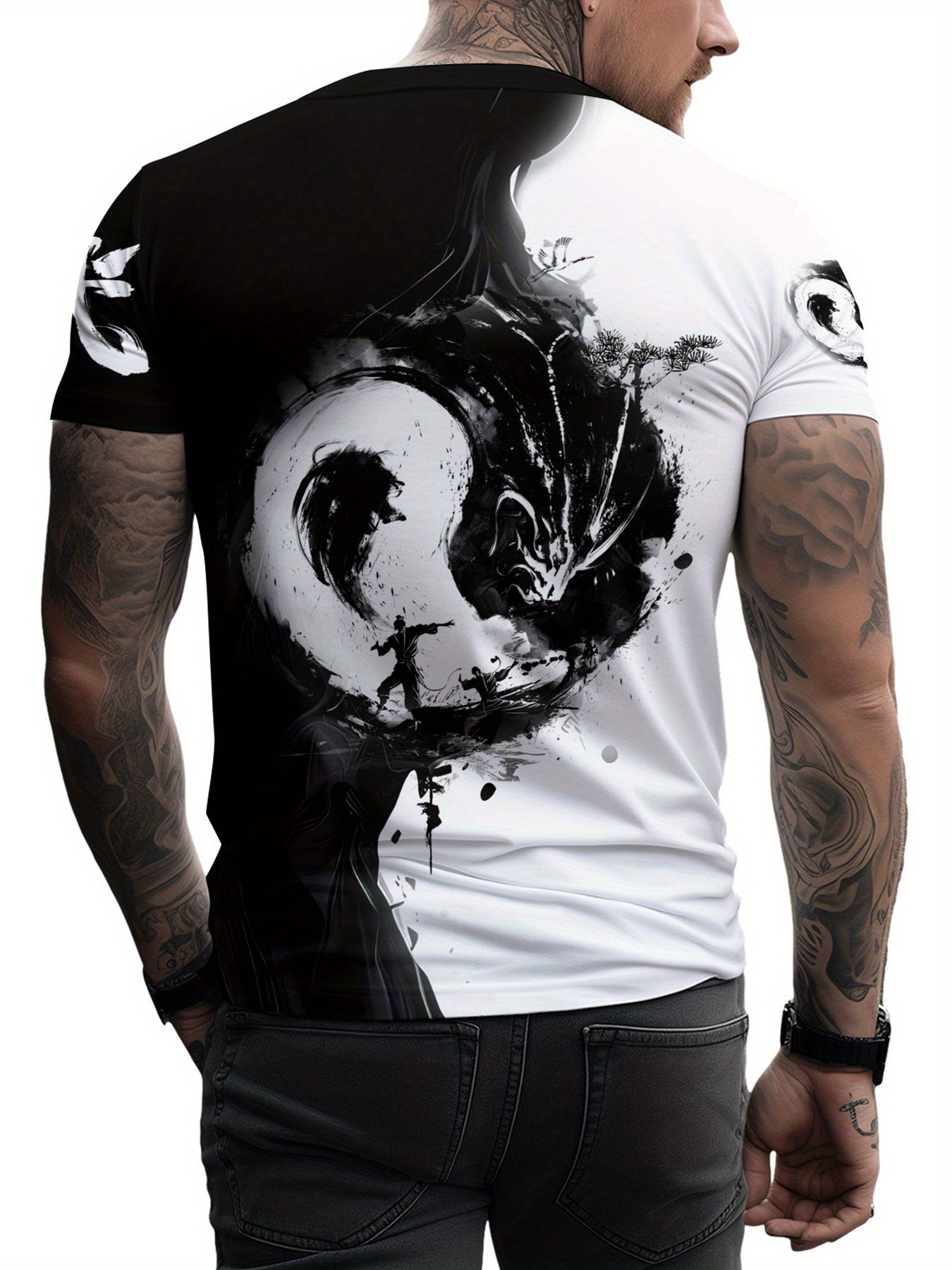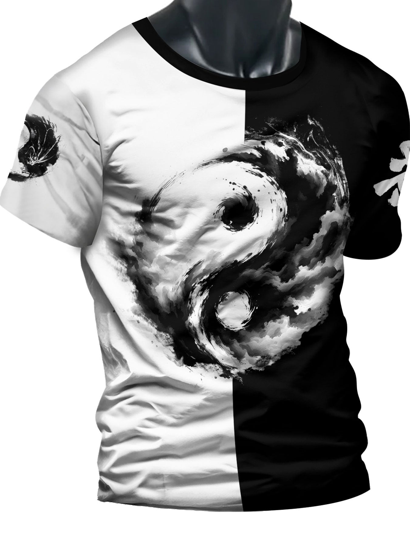 Տղամարդու Յին Յանգ 3D տպագրությամբ մարզաշապիկ՝ առօրյա, կլոր վզնոցով պոլիեսթերային մարզաշապիկ, թեթևակի ձգվող տրիկոտաժե գործվածք, սովորական չափս, 100% պոլիեսթերային մանրաթել, 100 գ/մ²