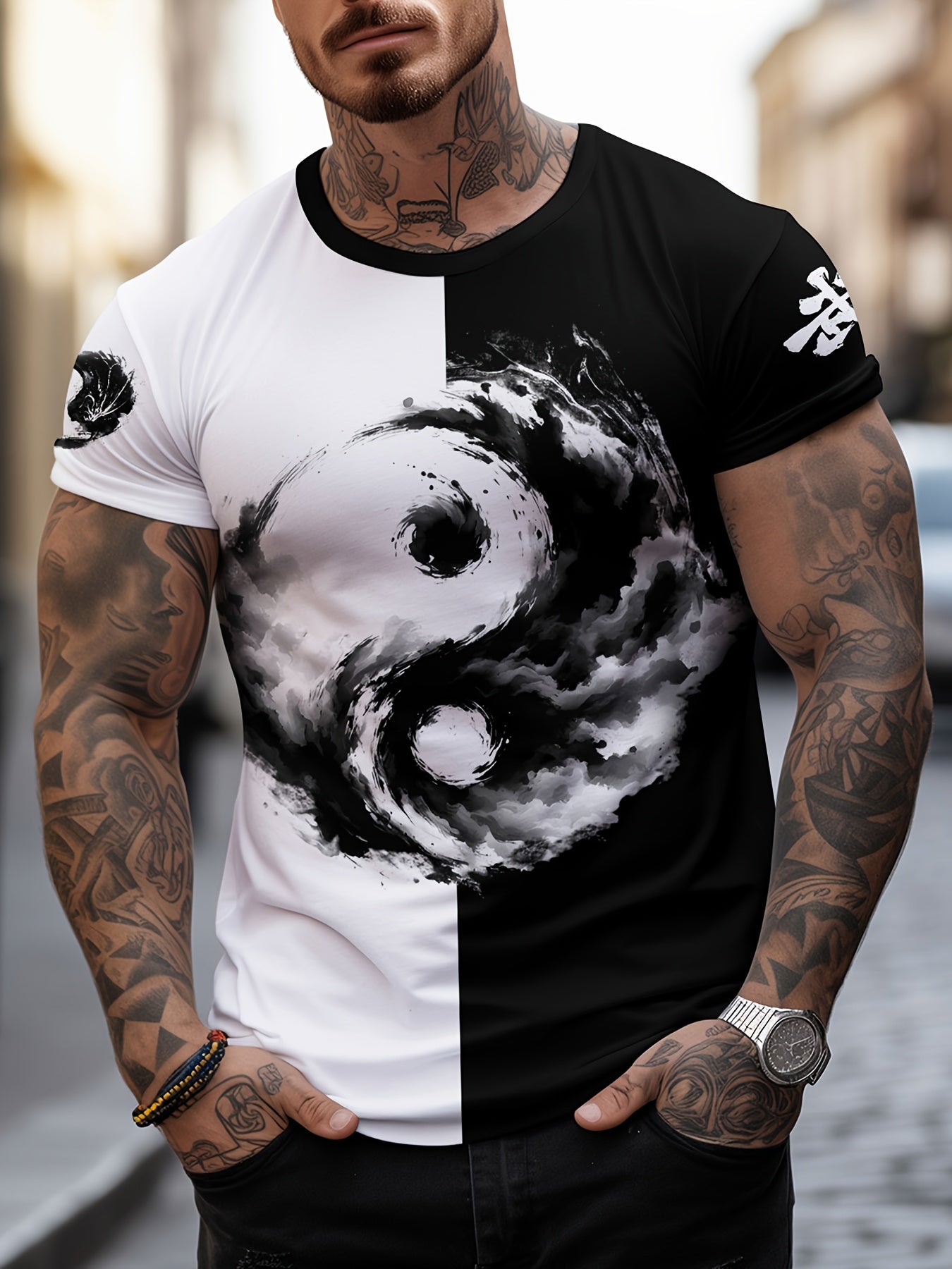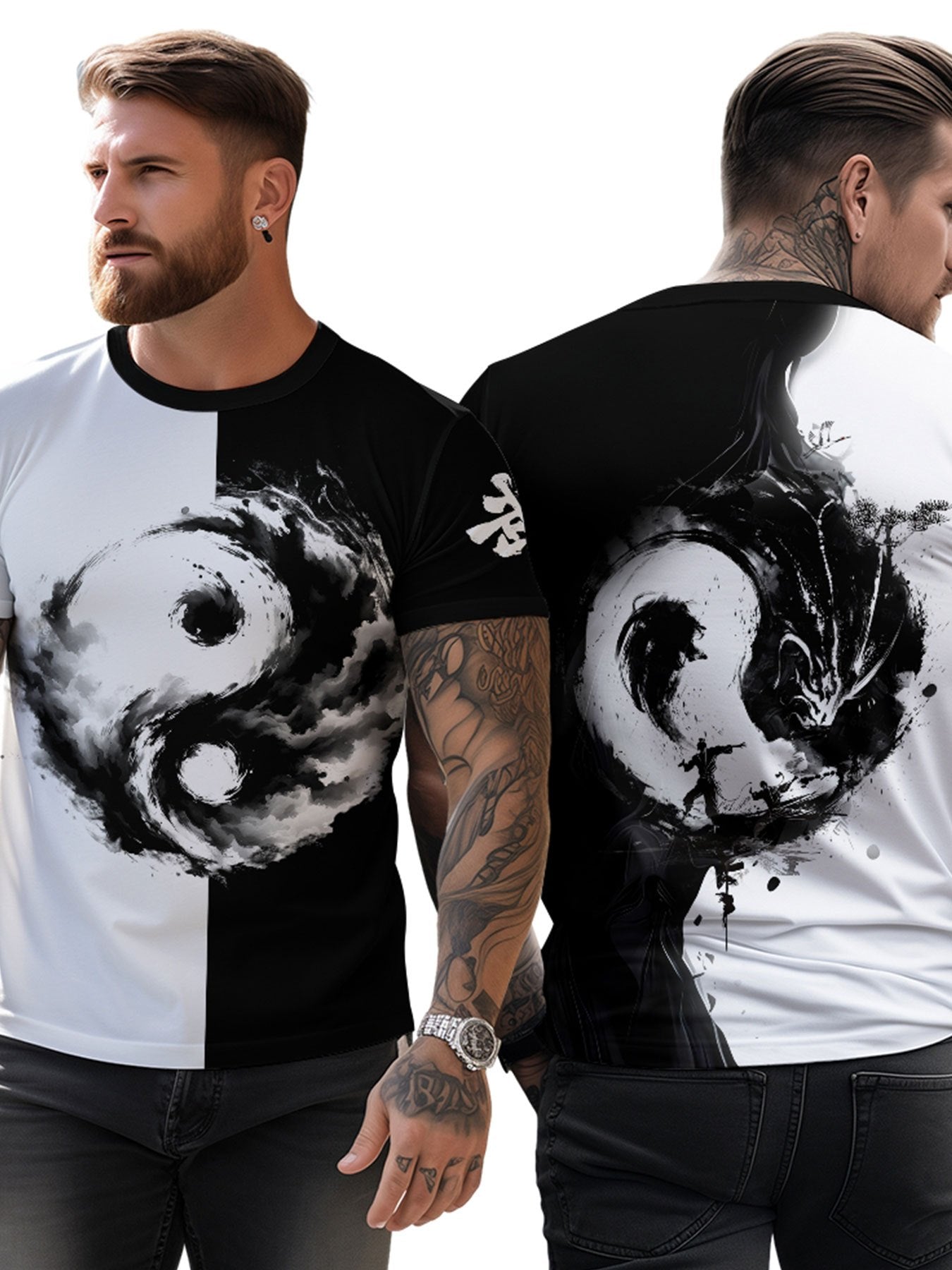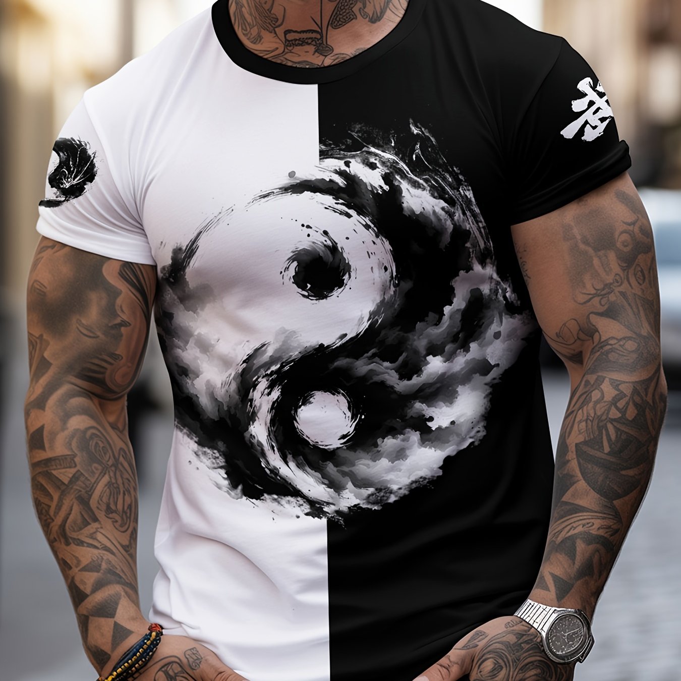 Տղամարդու Յին Յանգ 3D տպագրությամբ մարզաշապիկ՝ առօրյա, կլոր վզնոցով պոլիեսթերային մարզաշապիկ, թեթևակի ձգվող տրիկոտաժե գործվածք, սովորական չափս, 100% պոլիեսթերային մանրաթել, 100 գ/մ²