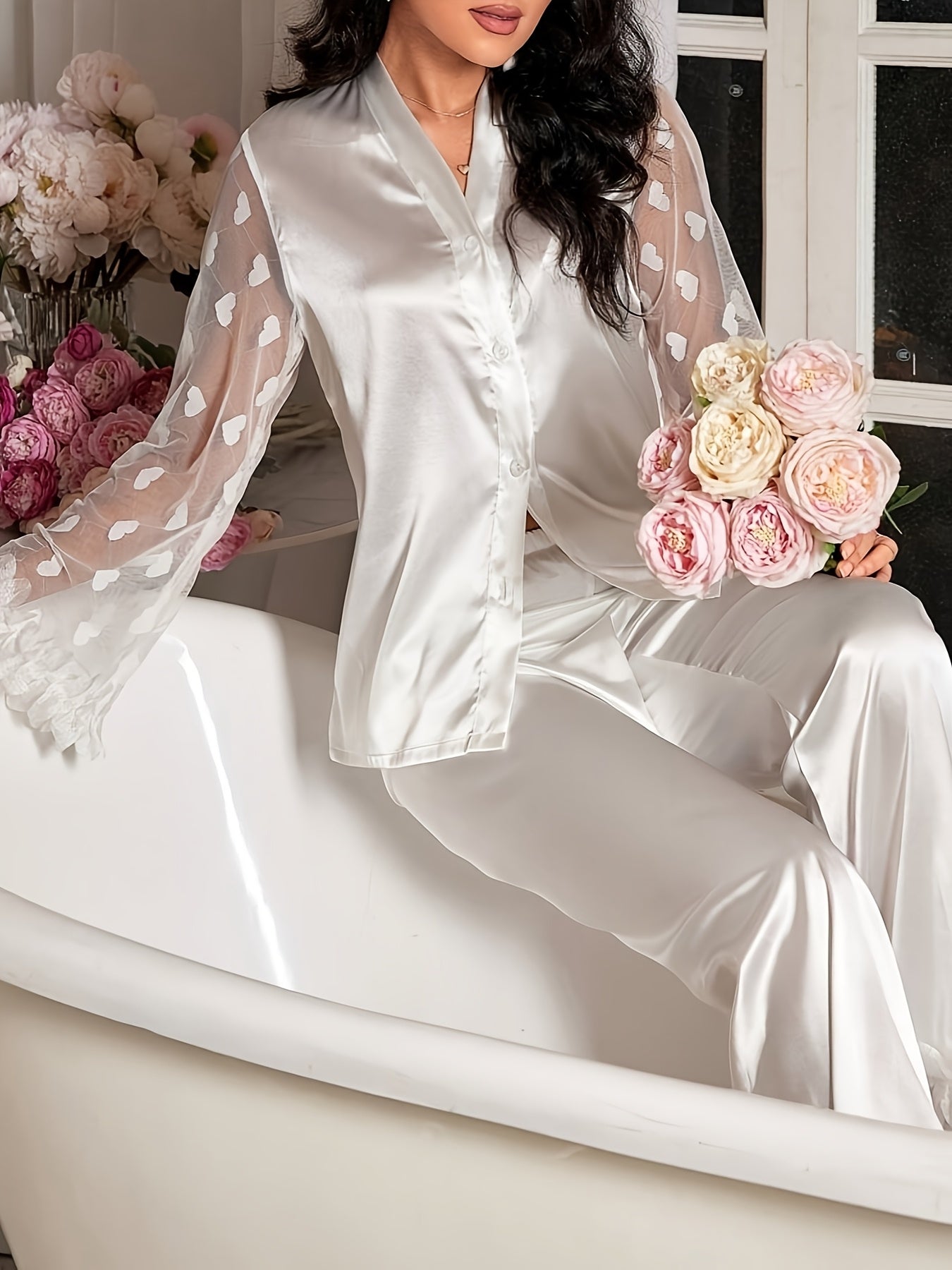 Կանացի եռաչափ ժանյակավոր սրտաձև ցանցով, փայտե ծաղկային թևքերով երկար թևքերով պիժամայի հավաքածու՝ ծալքավոր եզրով, միագույն, բոլոր եղանակների հարմարավետություն, երկար տաբատ, սպագետի ժապավենով օձիք, գրպանի փակում