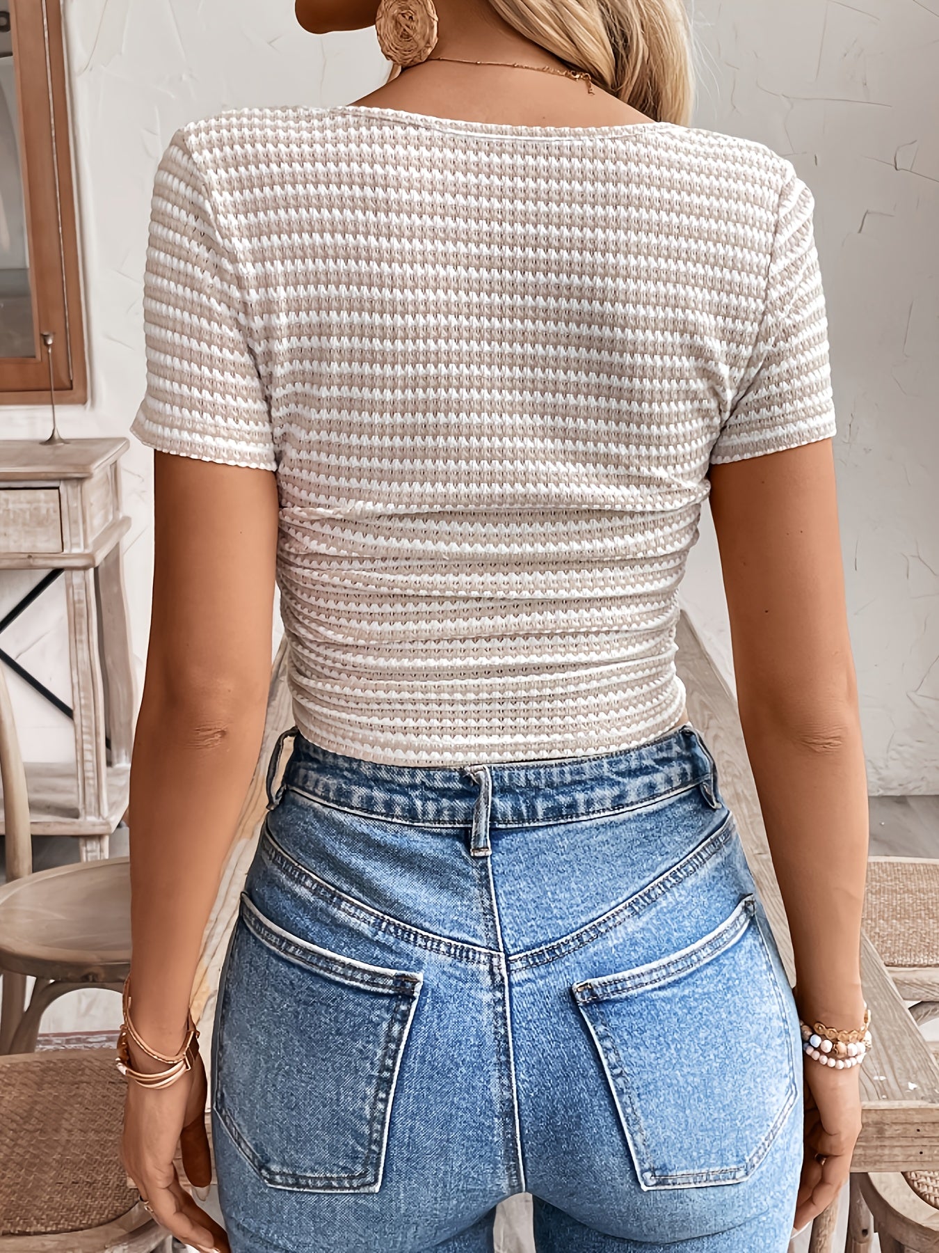 Կանացի էլեգանտ գծավոր, քառակուսի վզով կարճ թևքով վերնաշապիկ - կիսաթափանցիկ բլուզ՝ կարճ կտրվածքով, լվացքի մեքենայով լվացվող գարուն-ամառ առօրյա, շքեղ վերնաշապիկներ, կարճ վերնաշապիկով բլուզ, առօրյա հագուստ, նրբագեղ հյուսվածք