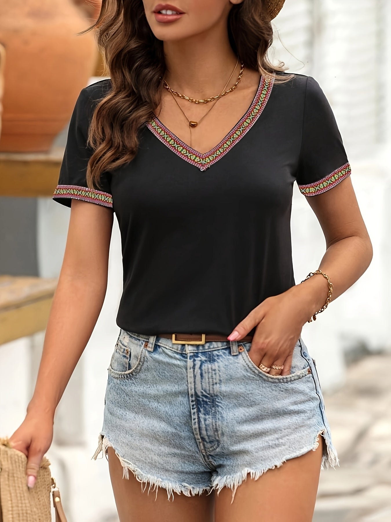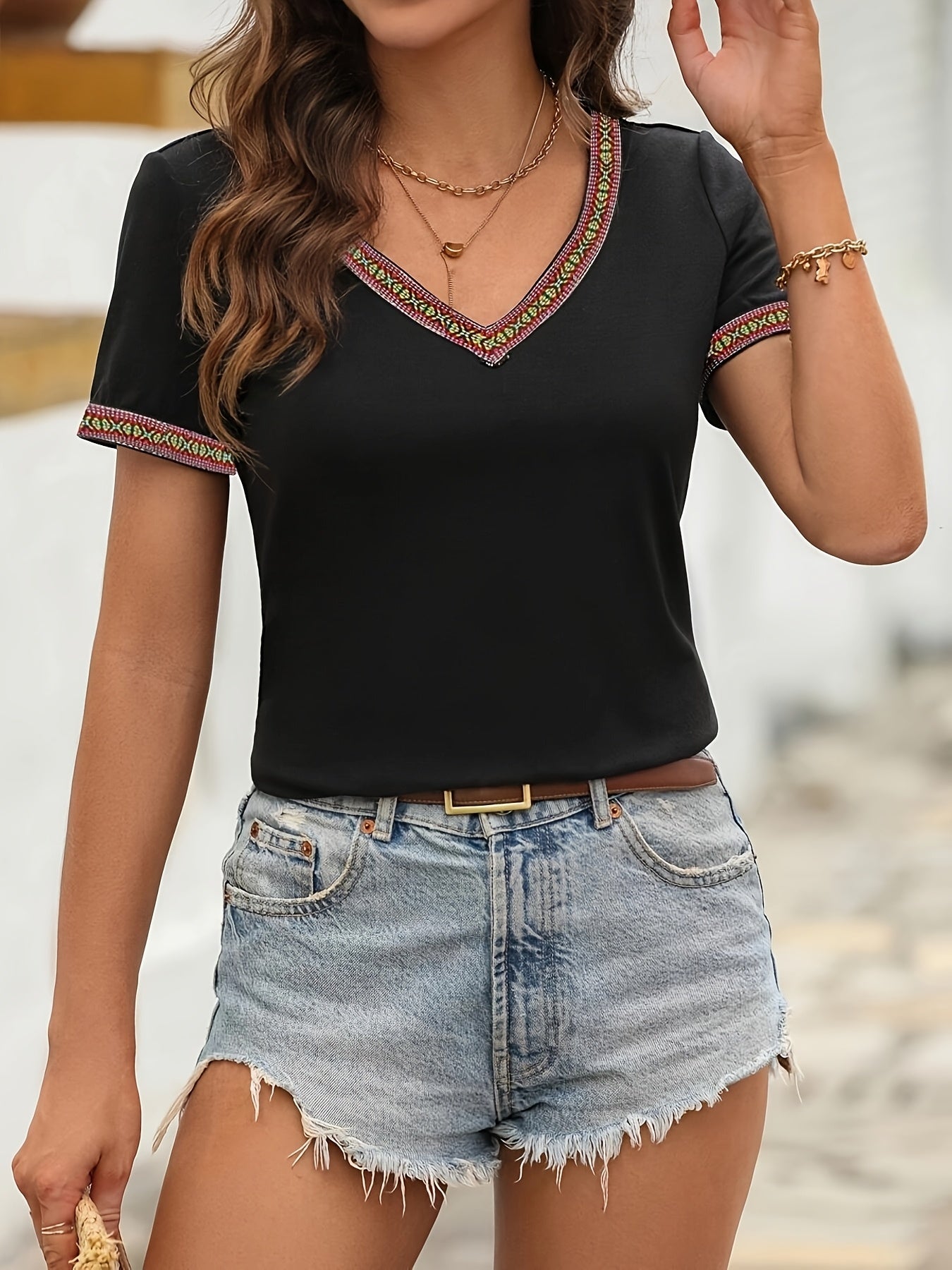 Կանացի էլեգանտ V-ձև օձիքով մարզաշապիկ՝ հակադիր գույների շեշտադրումներով - սև և բազմագույն երկրաչափական նախշերով, կարճ թևքերով գարուն/ամառային վերնաշապիկ, լվացքի մեքենայով լվացվող, ամենօրյա նորաձևություն, անթափանց գործվածք