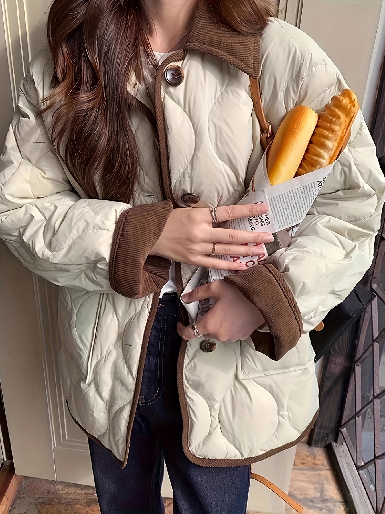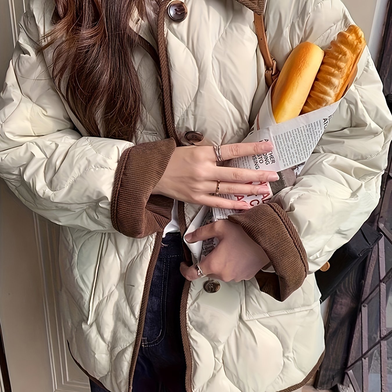 Կանացի մուգ կապույտ կարված բաճկոն՝ արհեստական մորթուց զարդանախշով - Էլեգանտ երկար թևքերով վերնազգեստ, պոլիեսթեր, կոճակներով առջևի մաս, տաք և նորաձև ձմռան համար