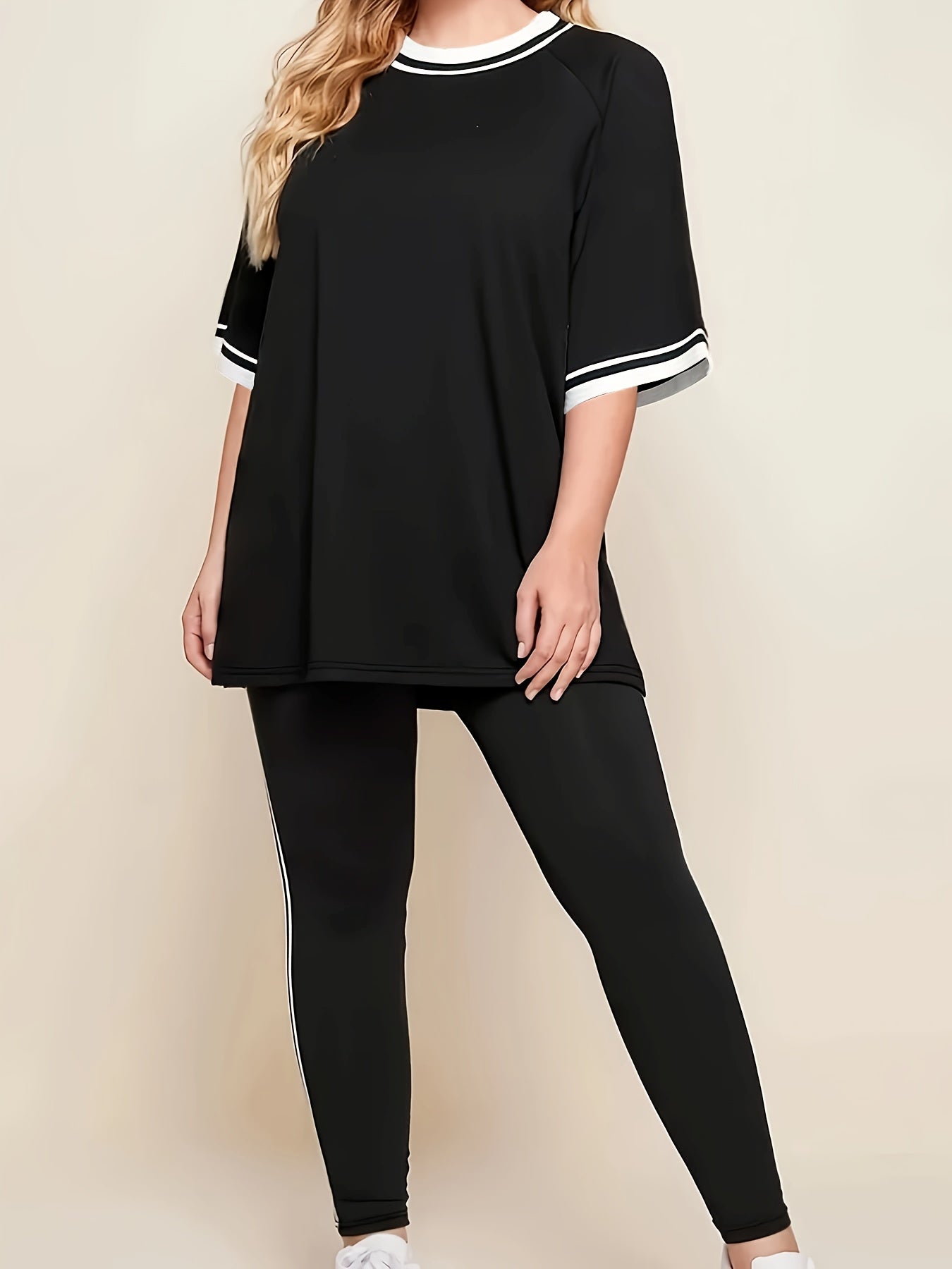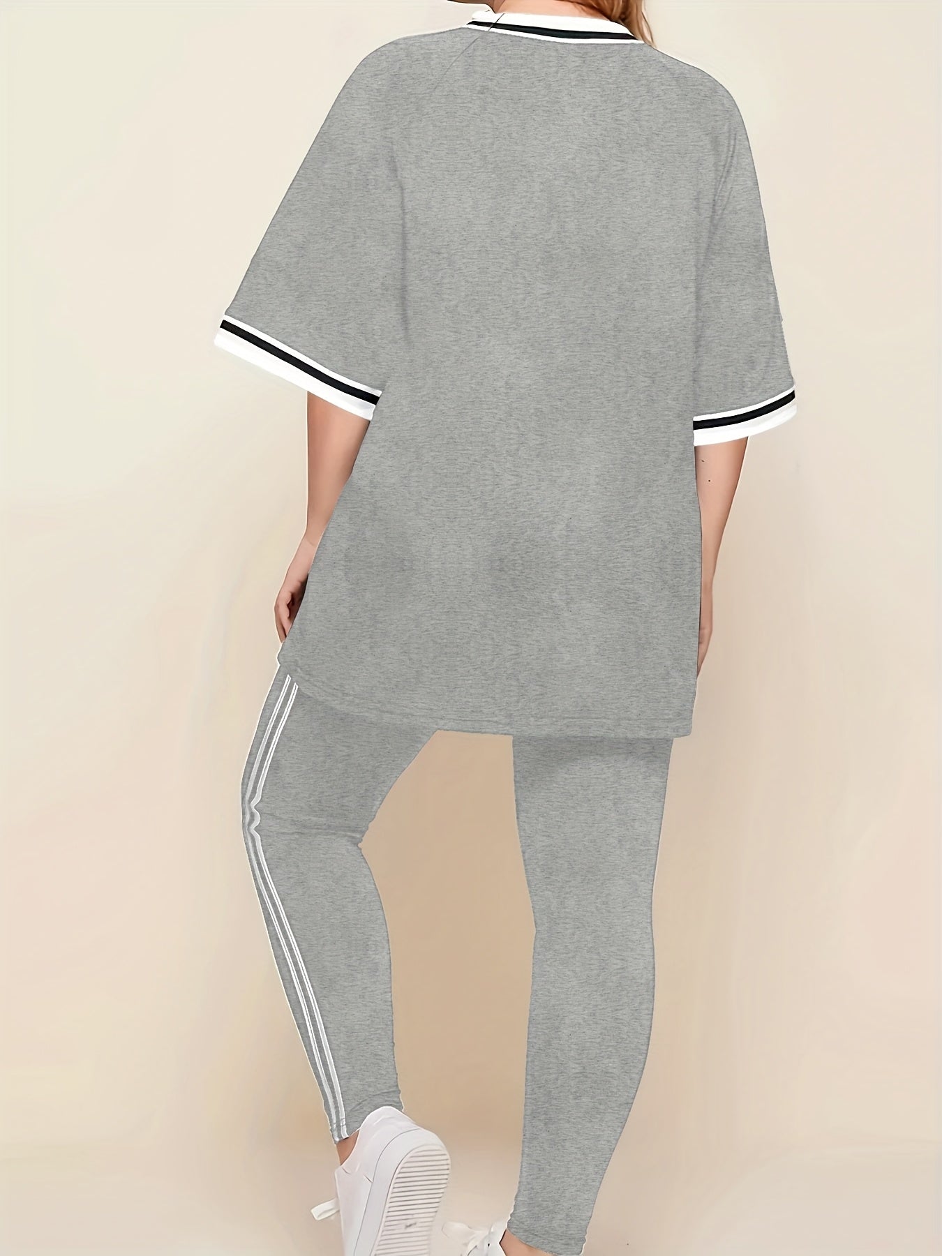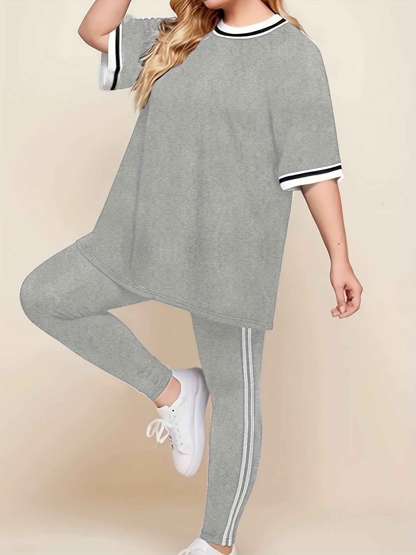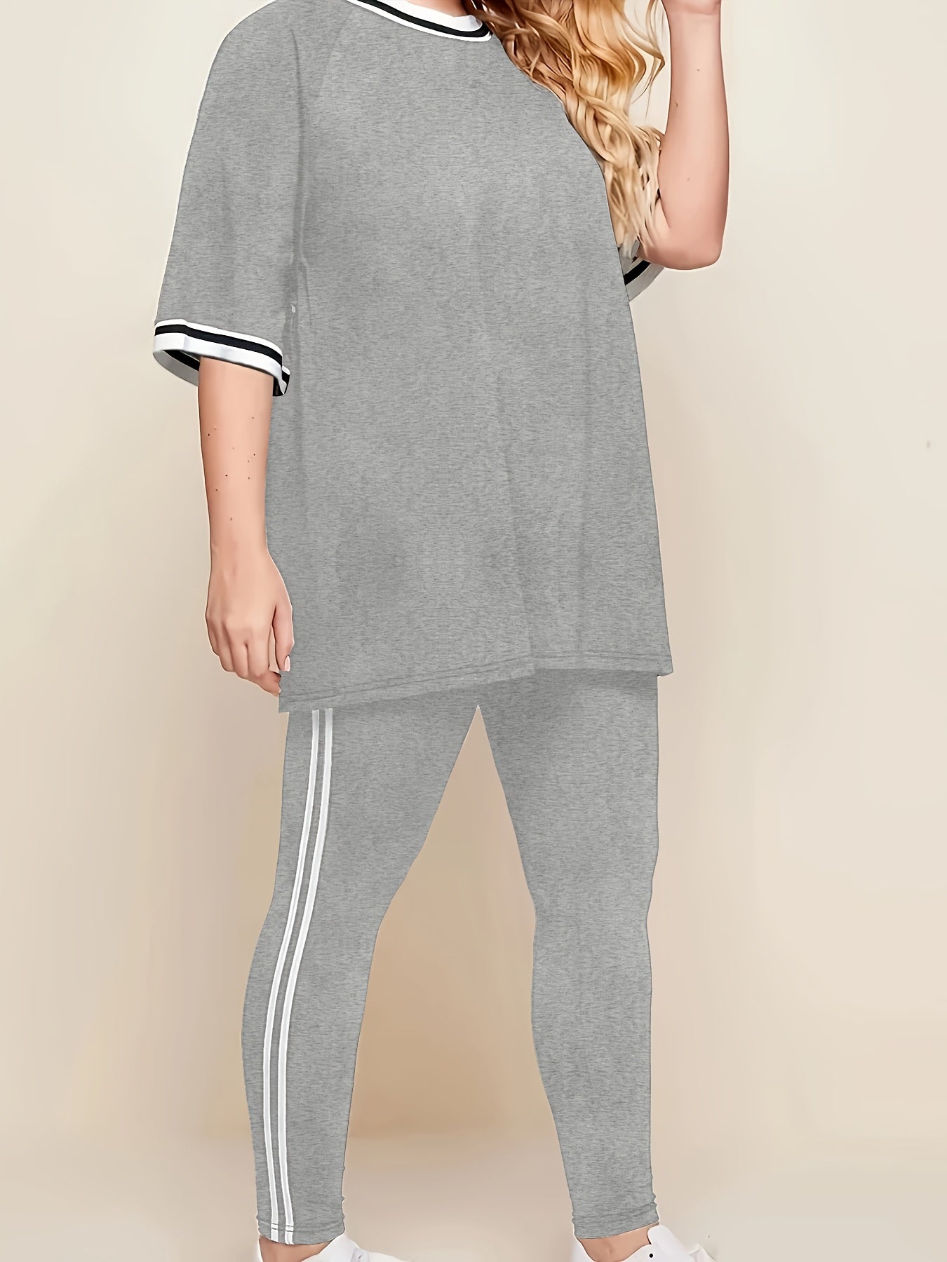 Կանացի մեծ չափսի առօրյա հանգստի հավաքածու - մոխրագույն և սպիտակ գծավոր մեծ չափսի մարզաշապիկ համապատասխան մարզաշապիկով, հարմարավետ բոլոր եղանակների տնային հագուստ, մարզաշապիկներ կանանց համար