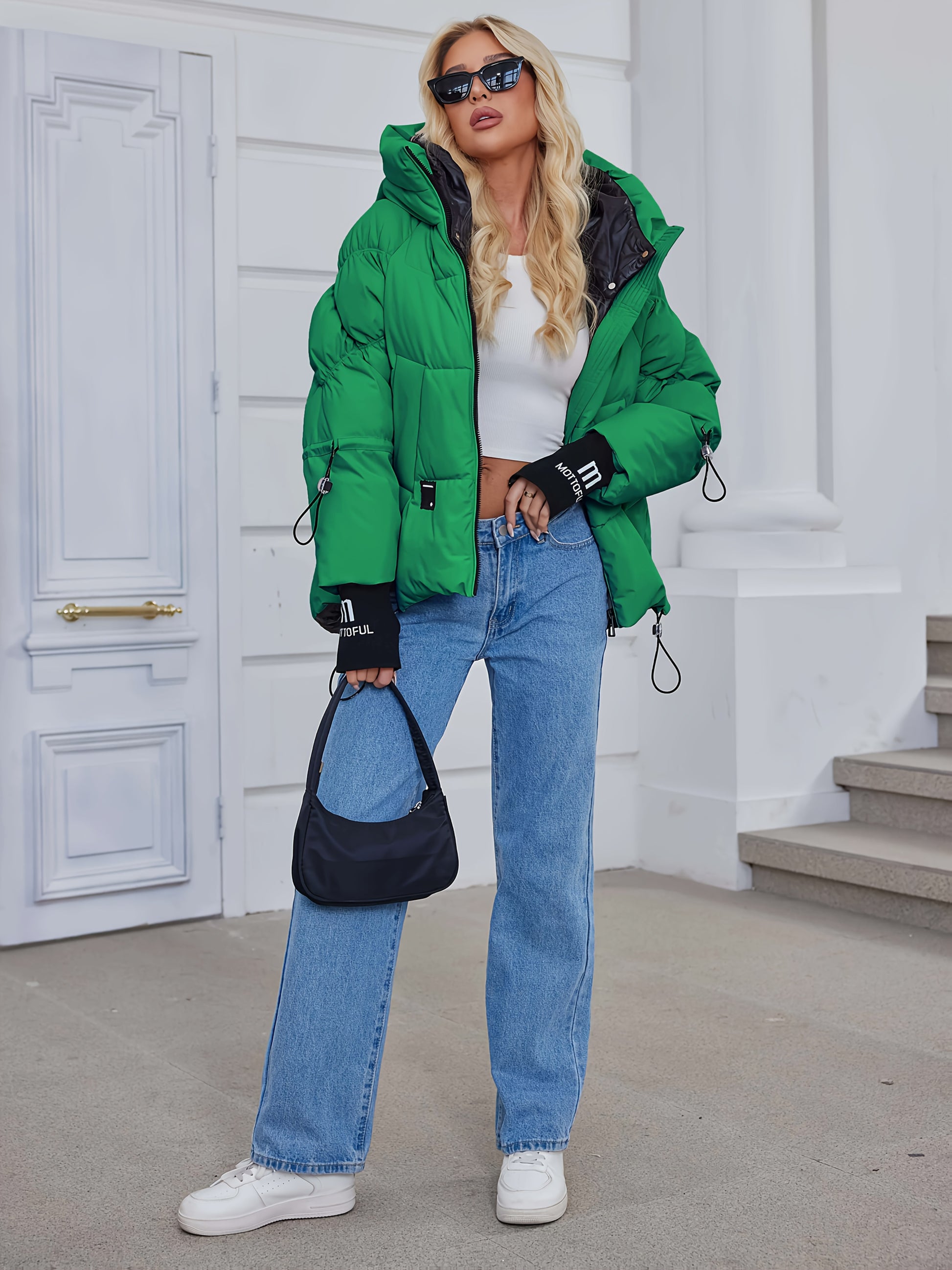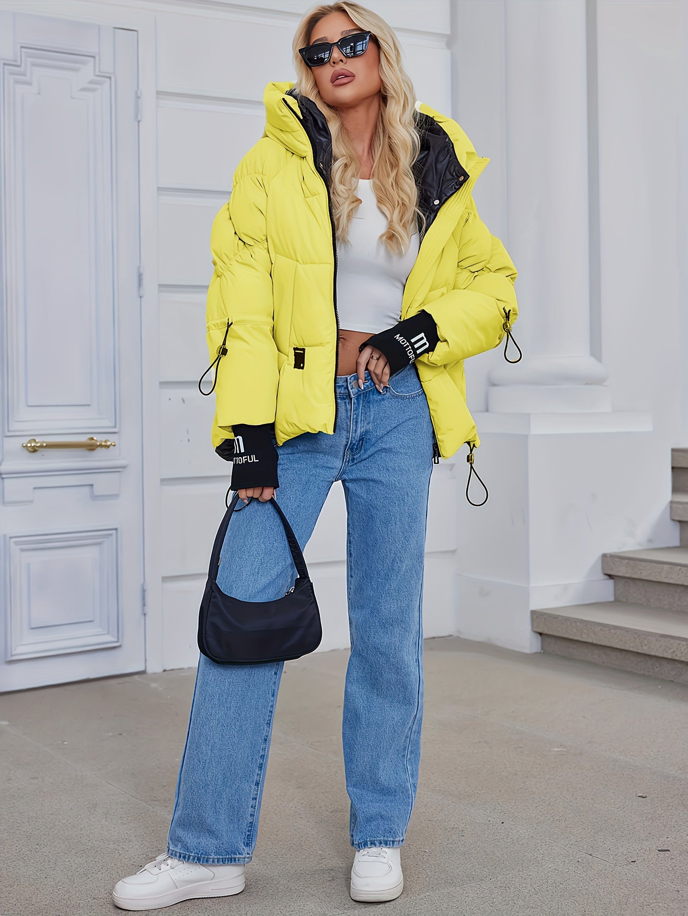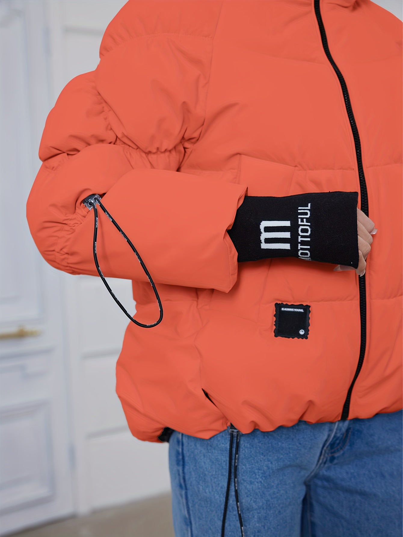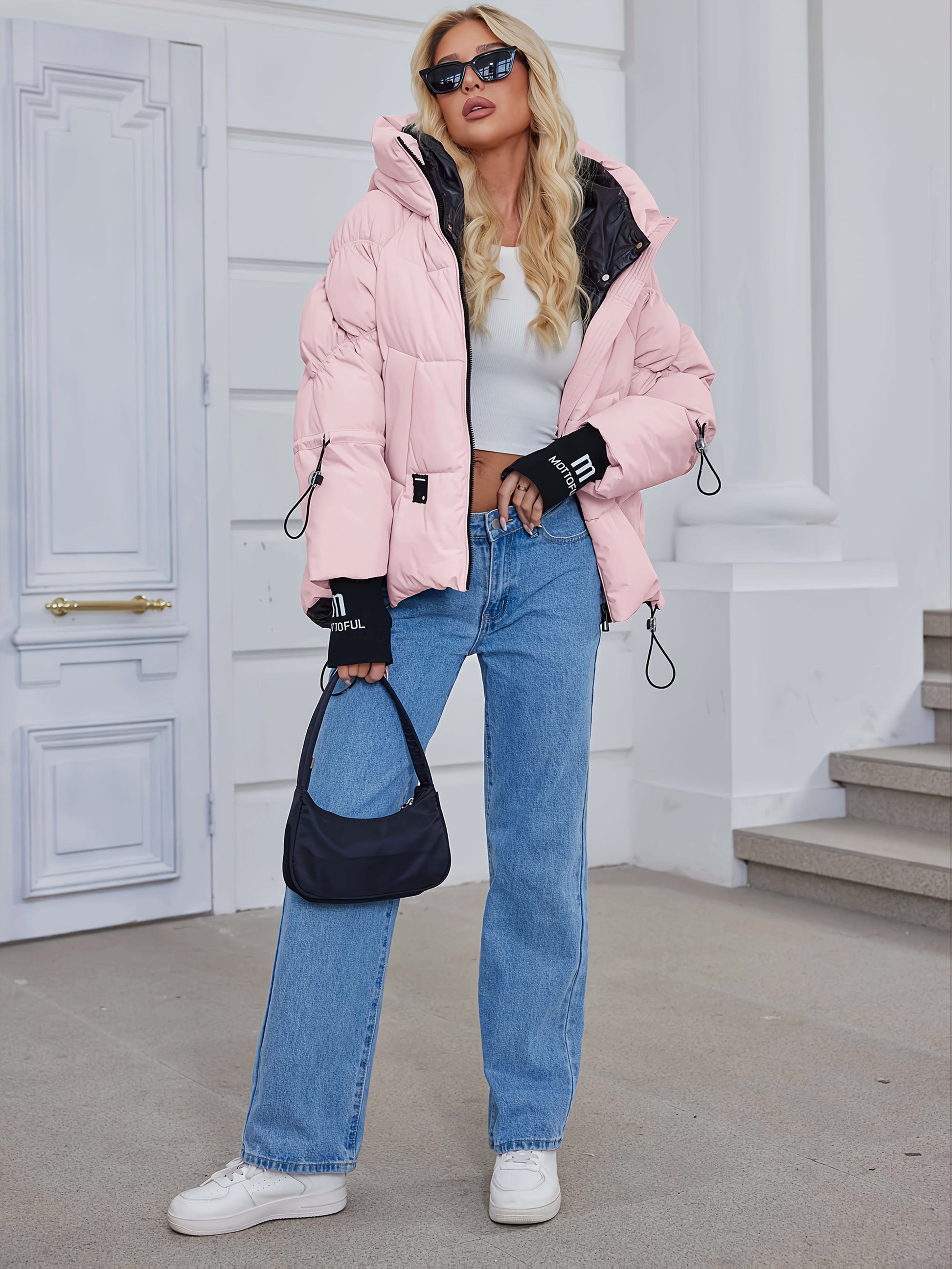 Կանացի ոճային բեժ գույնի փքված բաճկոն՝ առօրյա տաք ձմեռային վերարկու՝ սև եզրագծով, երկար թևքերով և կայծակաճարմանդով գլխարկով, պոլիեսթերային գործվածք՝ բացօթյա հարմարավետության համար։