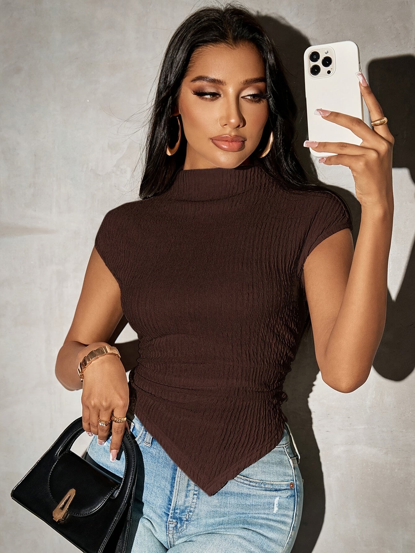 Կանացի ոճային, բարձր օձիքով, ասիմետրիկ, կարճ թևքերով, ուսերը իջեցրած մարզաշապիկ