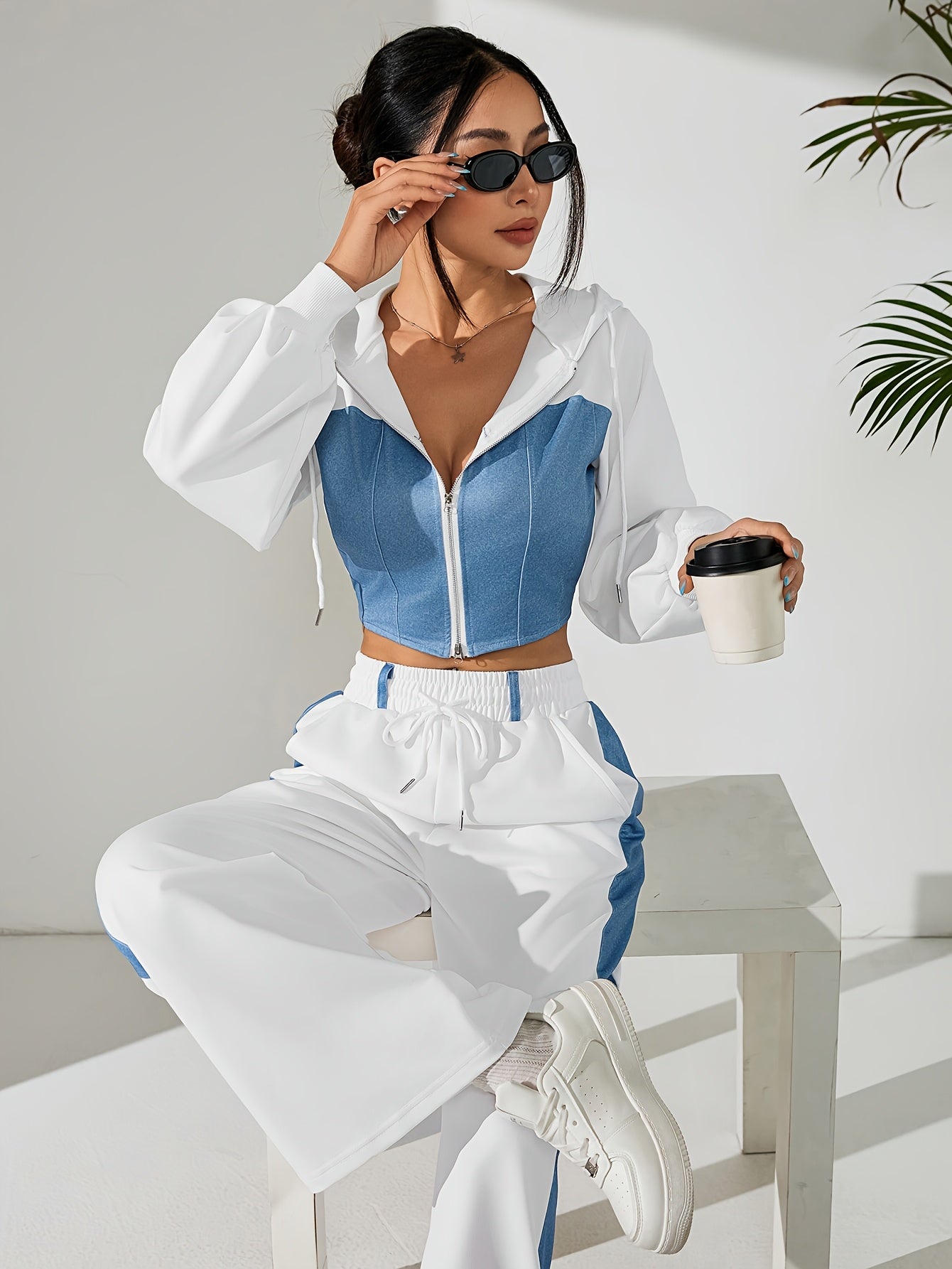 Women'S Stylish Two-Piece Set - Blue & Black Zip-Up Hoodie with Pockets, Long Sleeve Crop Top, and Wide-Leg Pants, Perfect for Spring/Fall, Casual Elegance, Casual Attire|Modern Casualwear|Zippered Hoodie