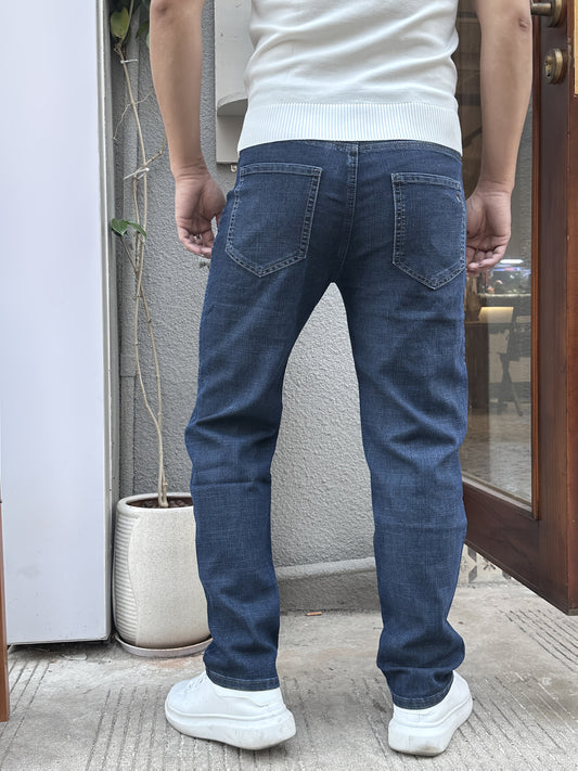 Պրեմիում պատահական տղամարդկանց ջինսեր՝ բարակ կահավորանքով, հարմար է թեթև բիզնես հագուստի համար, որն ունի ձգվող գործվածք և նորաձև կապույտ լվացում: