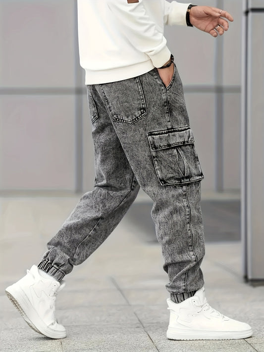 Տղամարդկանց Slim Fit Cargo Jeans - Նորաոճ մոխրագույն ջինսե մի քանի գրպաններով, դիմացկուն բամբակ/պոլիեսթեր խառնուրդ, հագուստ բոլոր սեզոններին