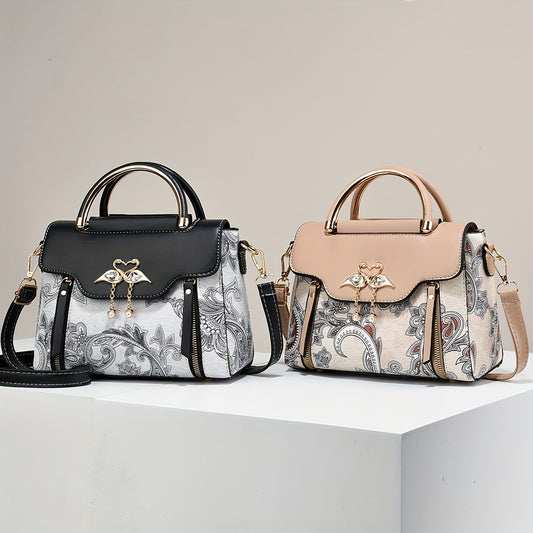 Կանացի էլեգանտ ծաղկային նախշերով պայուսակ՝ մագնիսական փակմամբ, կարգավորվող ժապավենով և մետաղական կարապի տեսքով սրտաձև կախազարդով, արհեստական կաշվից ուսի պայուսակ՝ պոլիեսթերային աստառով և ներկված եզրերով, կանացի պայուսակ