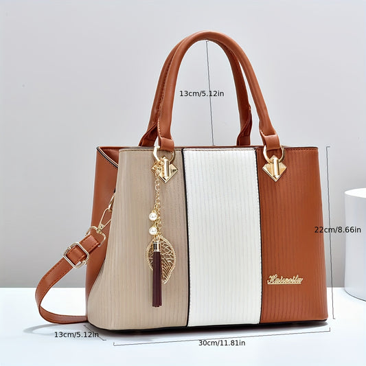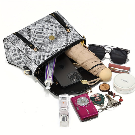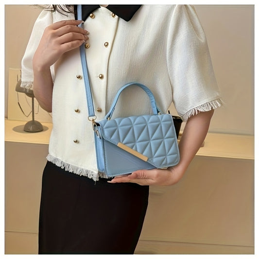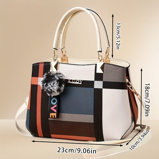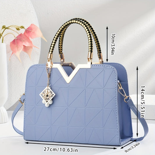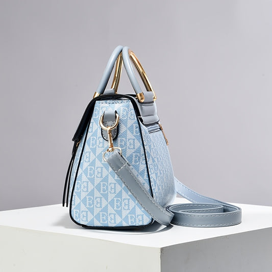 Stylish Women'S Shoulder Bag with Detachable Strap - Large Capacity, Geometric Pattern, White, Blue, and Brown, Perfect for Work, Parties, and Everyday Use, Party Accessory | Geometric Pattern Bag | Durable Zipper Closure, Pu