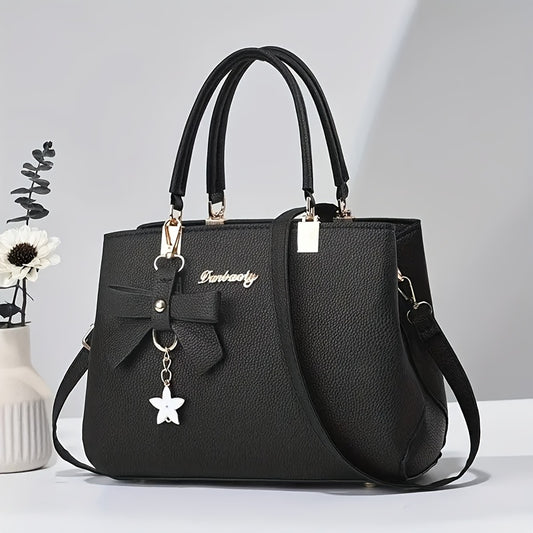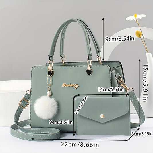 Stylish Lychee Pattern Handbag with Adjustable Strap and Pom Pom Ball Charms - Versatile Shoulder Handbag for Women in Black, Army Green, Khaki, Light Grey, Dark Grey, Red, Crossbody Purse, Charming Pom Pom Accents, Metallic