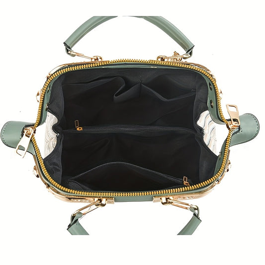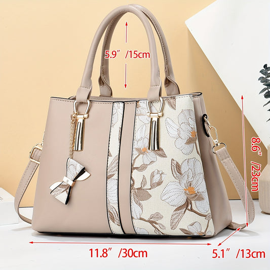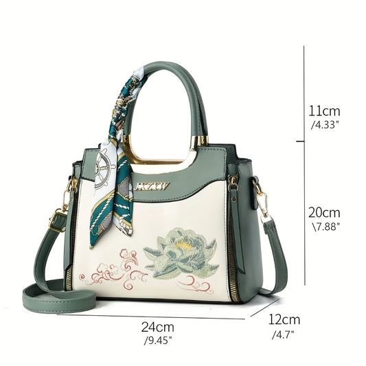 Stylish Women's Large Capacity Handbag with Floral Embroidery, Color-Block Design & Golden-Tone Hardware - Navy/Green/Wine Red, Polyester Lining, Secure Zipper Closure, Durable Commuter Tote for Work, Travel, Gift
