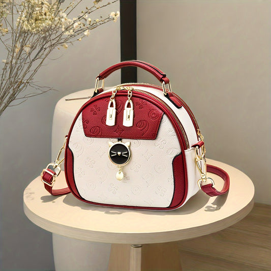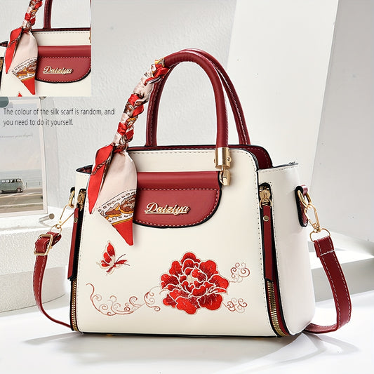 Կանացի ոճային ձեռքի պայուսակ - երկգույն կարմիր և սպիտակ դիզայն, ռելիեֆային ծաղկային նախշ, կարգավորվող ժապավեն, ոսկեգույն պարագաներ, իդեալական է առօրյա զբոսանքների և ճանապարհորդությունների համար, կանացի ձեռքի պայուսակներ