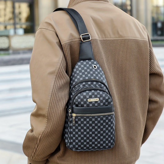 Տղամարդու ոճային երկրաչափական նախշերով պայուսակ - սև-սպիտակ կրծքավանդակի պայուսակ՝ ոսկեգույն կայծակաճարմանդով, կոմպակտ ճանապարհորդական և ամենօրյա օգտագործման մեջքի պայուսակ, ժամանակակից աքսեսուար | Տեքստուրավորված մշակում, կրծքավանդակի պայուսակ