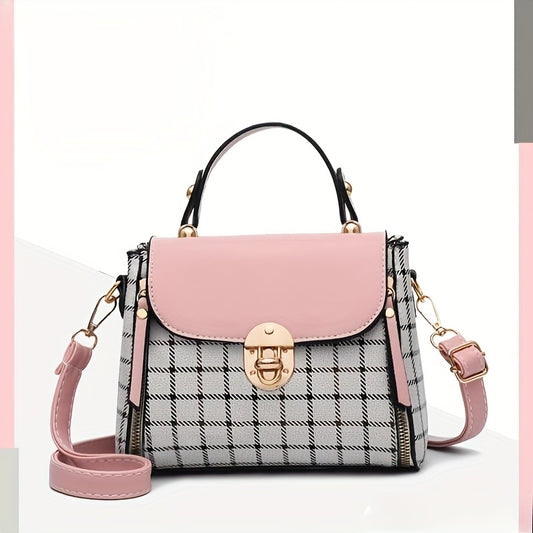 Կանացի վինտաժային քառակուսի ուսապարկ՝ հանվող ուսադիրով, ճարմանդով, պոլիեսթերե երեսպատմամբ և եզրային ներկով - վարդագույն և սև շախմատաձև դիզայն, իդեալական է դեռահասների և կանանց համար, հիանալի նվեր ծննդյան, տարեդարձի, Վալենտինի օրվա համար: