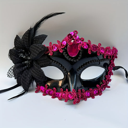 Elegant Venetian Masquerade Mask - Black & Red Feather & Jewel Decorated Party Mask for Halloween, Themed Dinners, Cosplay - Durable Plastic Design with Intricate Patterns, Halloween Costume Accessory, Themed Event Accessory,