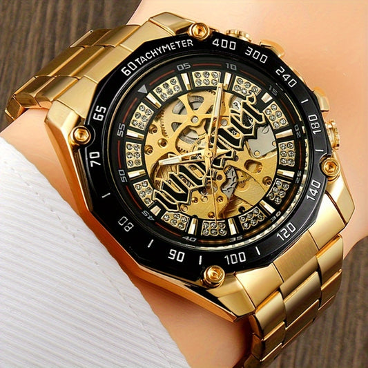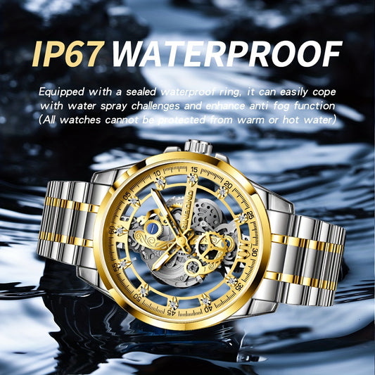 BINBOND տղամարդու նրբագեղ ոսկեգույն քվարցային ժամացույց՝ թափանցիկ երկկողմանի խոռոչավոր դիզայնով, ջրակայուն՝ լուսավոր սլաքներով, չժանգոտվող պողպատե ժապավեն, իդեալական նվեր