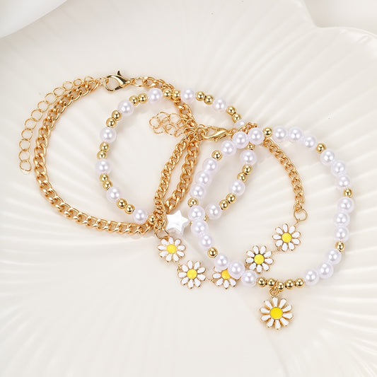 4 հատ Ամառային Նոր պատահական երեկույթ Փոքր Ոսկե ուլունք Մարգարիտ Ապարանջանի Հավաքածու, 4 հատ Bohemian Beach Daisy Ապարանջան կանանց համար, կատարյալ նվերների համար: