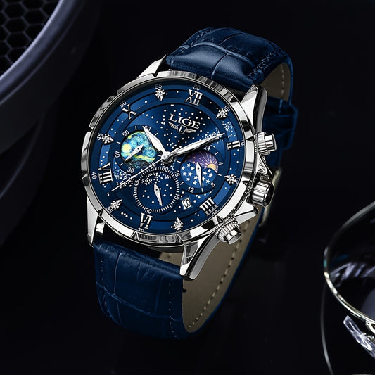 LIGE Լյուքս Քվարց Ժամացույց Լուսավորվող Սլաքներով - Էլեգանտ Կլոր Պողպատե Կորպուս, Կապույտ Ցիֆերբլատ Հռոմեական Թվերով, Աստղալից Գիշեր Դիզայն, Կոճակային Բատարիա, Արհեստական Կաշվե Գոտի, Ոճային Աքսեսուար | Աստղալից Գիշեր Դիզայն | Լուսավորվող Սլաքներ