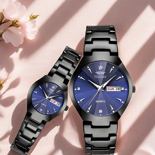 2 հատ Զույգի Ժամացույց Տղամարդու և Կնոջ համար - Չժանգոտվող Պողպատե Թևնոց, Շքեղ Քարերով Զարդարված, Լուսավորվող HD Ցուցիչ Շաբաթվա Օրացույցով, Քվարցային Շարժիչ, Էլեգանտ Ընծա Սիրահարների Օրվա, Մայրերի Օրվա, Հայրերի Օրվա, Հատուկ Իրադարձության Ժամացույց |