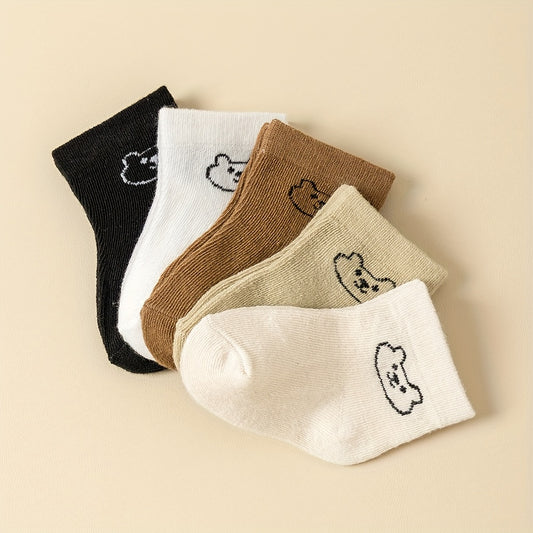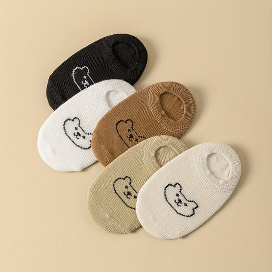5pcs Adorable Bear Pattern Low-Cut Ankle Socks for Youngsters & Youngsters - Soft, Stretchy Polyester Blend, Machine Washable - Perfect for All Seasons, Available in Brown, Beige, White, Black, Youngsters Ankle Socks|Cute Bea