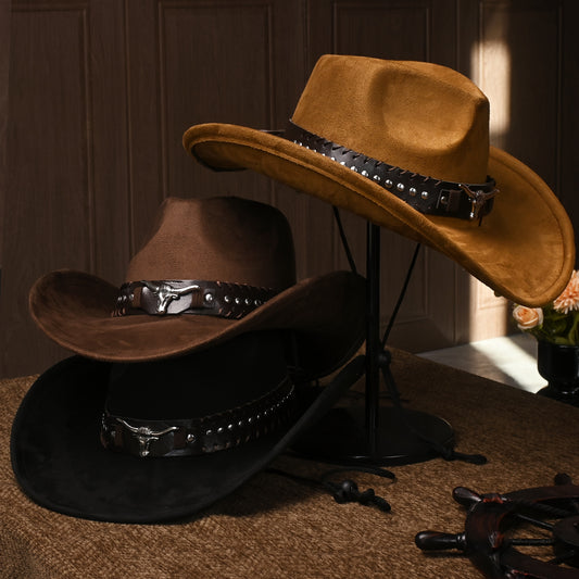 Արևմտյան կովբոյական գլխարկներ տղամարդկանց և կանանց համար, դասական արհեստական զամշից՝ մետաղական կեռիկներով և ցլի նախշերով, թեթև ունիսեքս տոնական առիթների գլխարկ, հյուսված ոչ առաձգական պոլիեսթեր՝ դեկորատիվ աքսեսուարներով, առանց փետուրների, չլվացվող