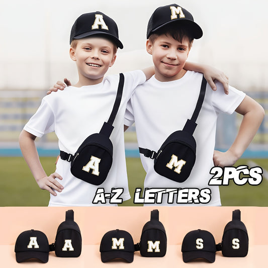 2 հատ մանկական 26 տառանոց տպագրությամբ գլխարկի և կրծքավանդակի պայուսակի հավաքածու, նորաձև արևային գլխարկ՝ դյուրակիր պահեստային դրամապանակով, հարմար է տղաների, աղջիկների, գարուն-ամառ ամենօրյա զբոսանքների համար, կատարյալ նվեր դպրոց վերադառնալու սեզոնի համար