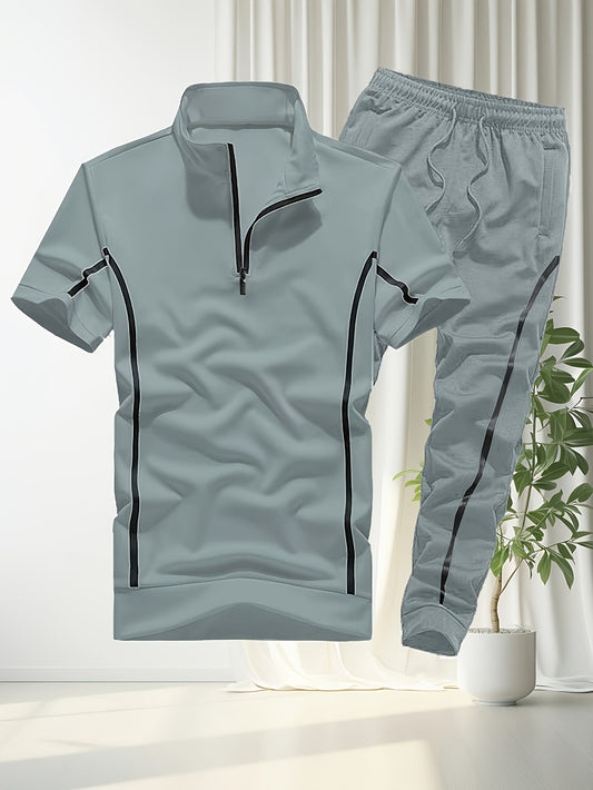 Տղամարդու ամառային առօրյա երկու մասից բաղկացած հավաքածու՝ ազատ չափի կարճ թևքերով, կայծակաճարմանդով պոլո շապիկ և կողային գծերով ջոգերներ, պոլիեսթեր, իդեալական է շոգ եղանակի համար, ամառային առօրյա հագուստի համար | Գծավոր նախշերով | պոլիեսթերային գործվածք