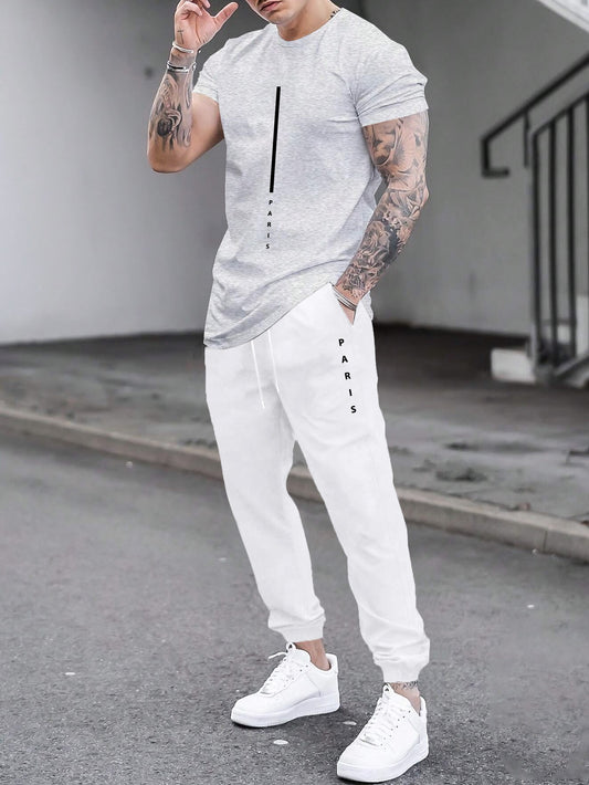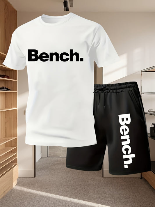 Ամառային տղամարդկանց համար նախատեսված կարճ թևքով մարզաշապիկի և շորտերի հավաքածու, հարմարավետ, շնչող, հարմար է վազքի, վազքի, ֆիթնեսի և բացօթյա մարզումների համար, նստարան։ Տառերի տպագրությամբ դիզայն - 2 հատ